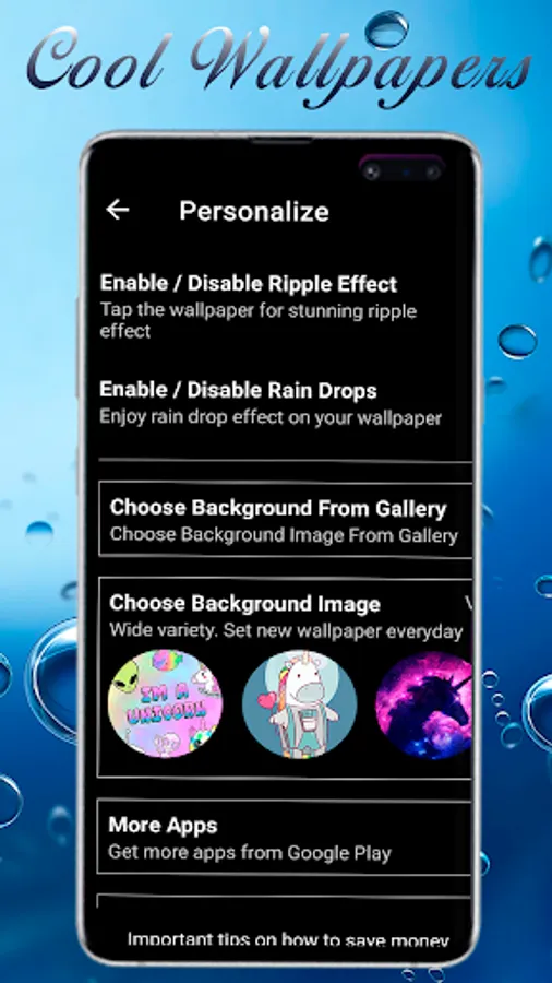 Now, if you need to change your style, you can just find a great example of cute, cool or kawaii girly, anime, teen, kpop, dope amd glitter 4K LIVE WALLPAPERS WITH WATER RIPPLE EFFECT here! You can customize this application very easily, without wasting battery charge and memory space!