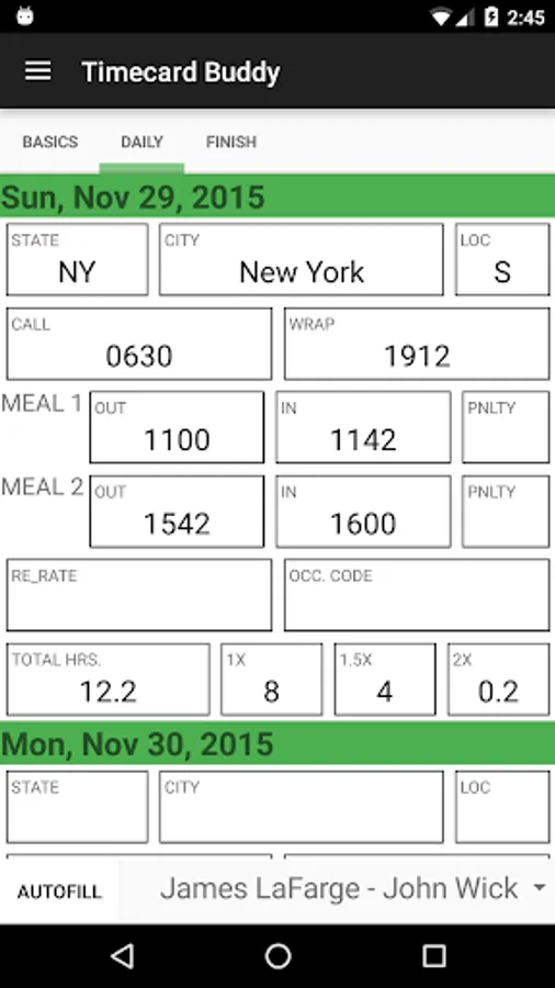 Timecard Buddy does not calculate times or provide statistics. With the exception of dates, only the fields you manually complete will be entered on the timecard.