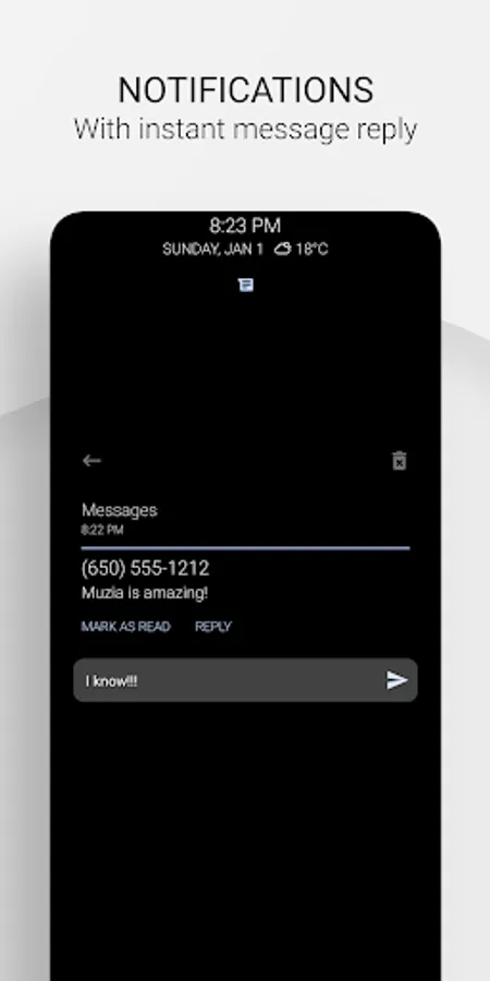 With Muzia you are able to respond directly to any instant message such as SMS, Facebook messenger, or WhatsApp right from your screen while you are listening to music without interruption. You can delete notifications or dismiss and save them for later. Muzia is a must have for any music lover out there.