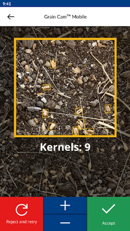 The loss level is determined by taking a picture of a small area right behind the combine. The app subsequently identifies and counts the number of kernels in that area and calculates the loss level as a percent of total yield and kilograms per hectare.