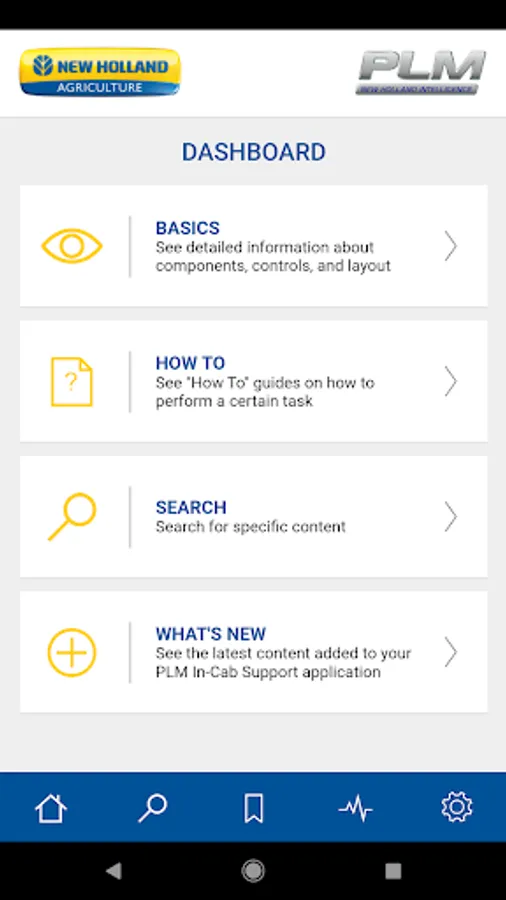The New Holland PLM In-Cab Support App will provide the operator support material to operate the IntelliView 12 and SideWinder Ultra Armrest.