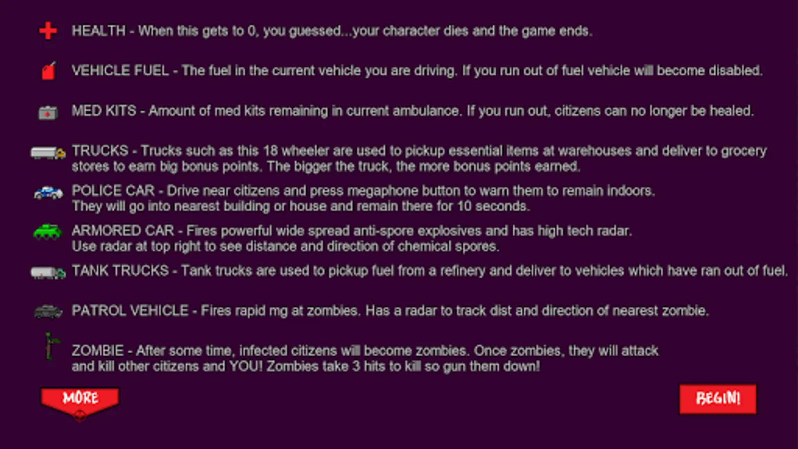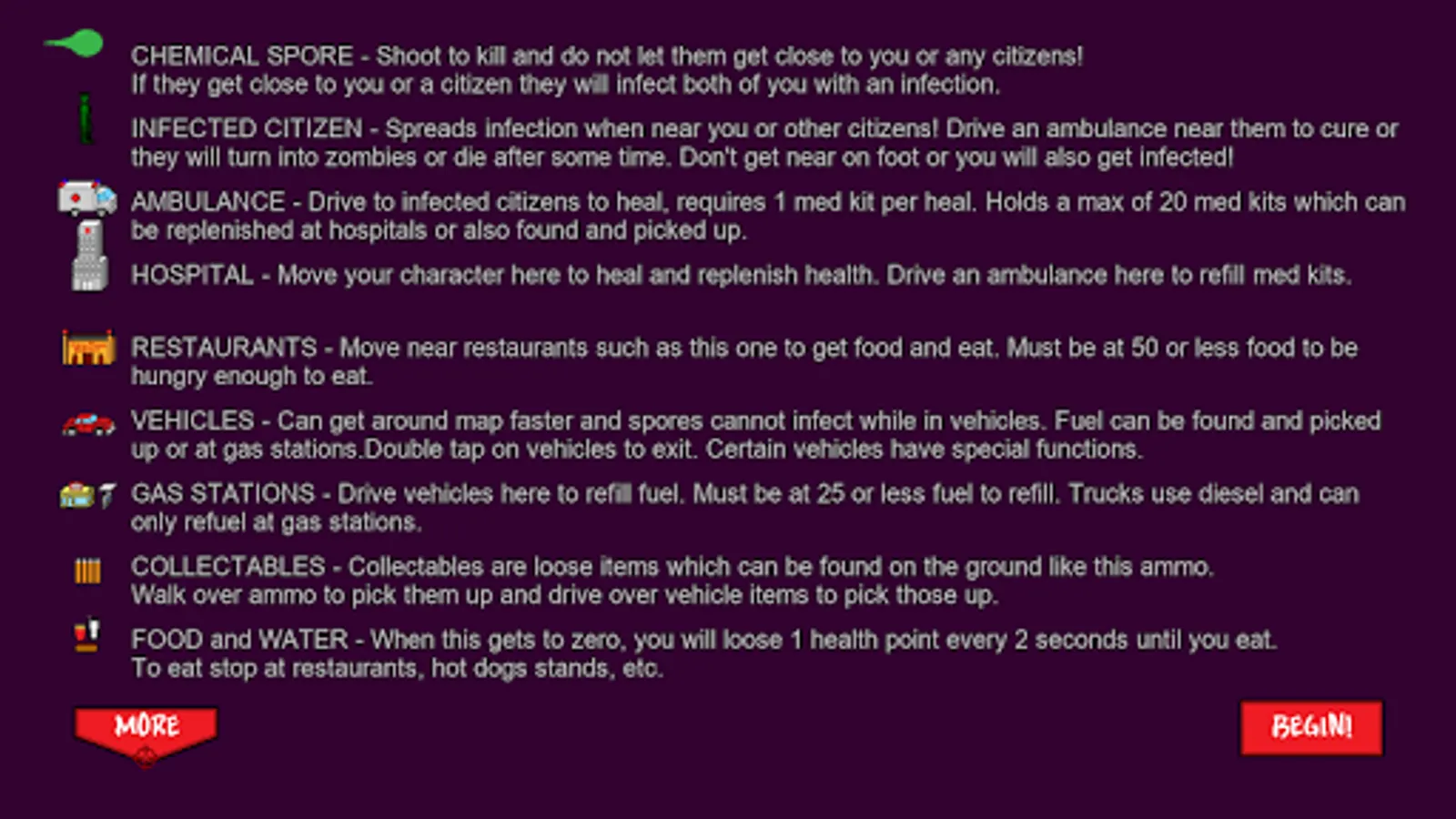 An accident at a chemical plant has caused dangerous chemical spores to pollute the air in city locations. If inhaled these chemical spores can be fatal or turn people into zombies! It is your jobs as a nation guard soldier to protect yourself and the citizens from these spores and zombies.