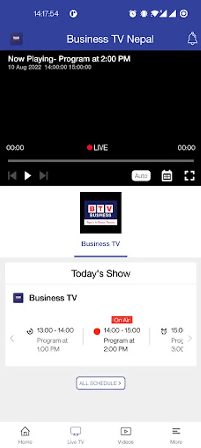 Business TV is the Nepal's first Business television channel and Business TV Nepal android app brings everything Business TV offers right at the users mobile device. Viewers of Business TV channel should not always be waiting to watch the news, interviews in their television set as Business TV Nepal android app helps you in getting stay updated from this Live app with the help of internet connected anywhere in the globe.