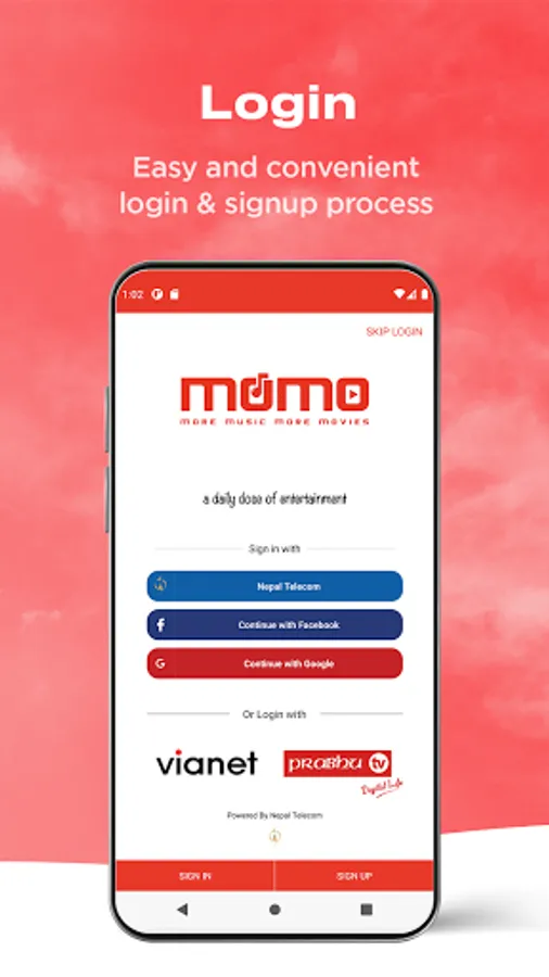 MOMO - More Music More Movies is an entertainment application where the users can log in through their Facebook, email, and NTC (Nepal Telecom) phone number and watch Nepalese Music (Geet), Movies, Music Videos, karaoke features, TV Shows, And Latest News.
