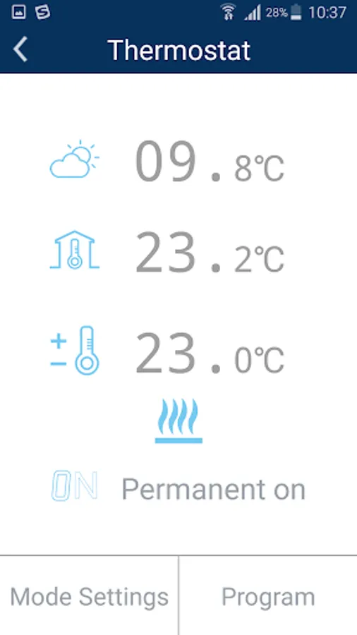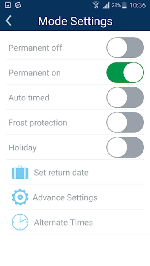 There are 5 operating modes, auto, off, on, frost, and holiday.