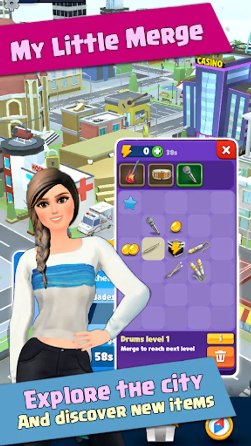 Merge items, complete orders and deliveries, get vehicles like cars, motorbikes, helicopters, find chest and boosters along the way, explore new places in the city and become a celebrity.