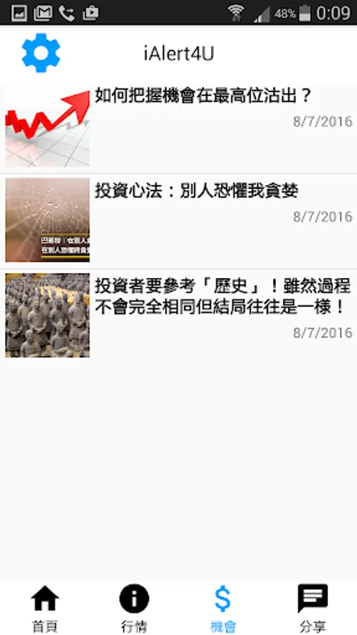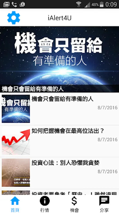 IAlert4U opportunities at hand every day with the latest market trends for you! Critical moment "Automatic push" message, so you had a head start! Opportunity to leave only those who are prepared! Looking for "opportunities" do not miss the opportunity at hand iAlert4U!