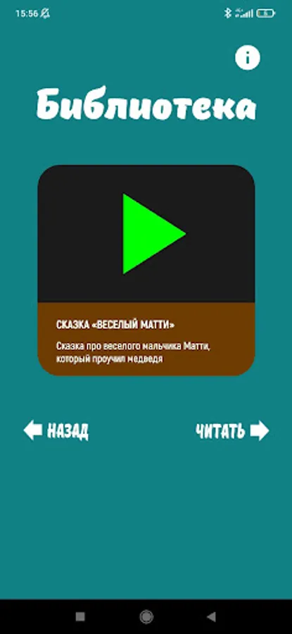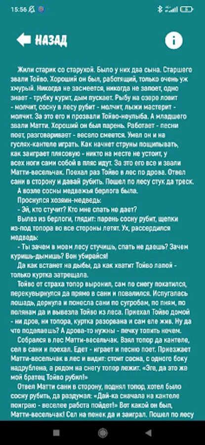 Children's media player designed to familiarize the younger generation with the national fairy tales of different peoples. This application allows you to both listen to audio versions of fairy tales and get acquainted with their text. The application was developed by students of the children's technopark "Quantorium Sampo" together with the regional public organization "Blue Road".