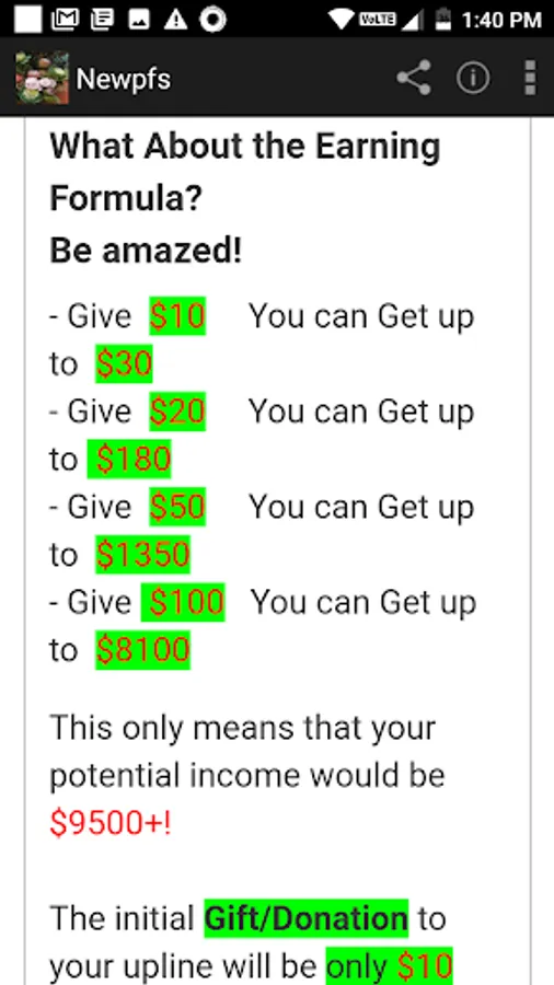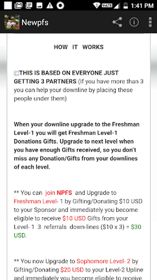 ** You can join NPFS and Upgrade to Freshman Level- 1 by Gifting/Donating $10 USD to your Sponsor and immediately you become eligible to receive $10 USD Gifts from your Level- 1 Your sponsor may Pay it forward for you. There is no limit to the Gifts you receive, it depends on how much you give and would like to receive in Donations