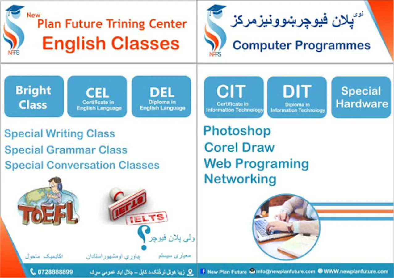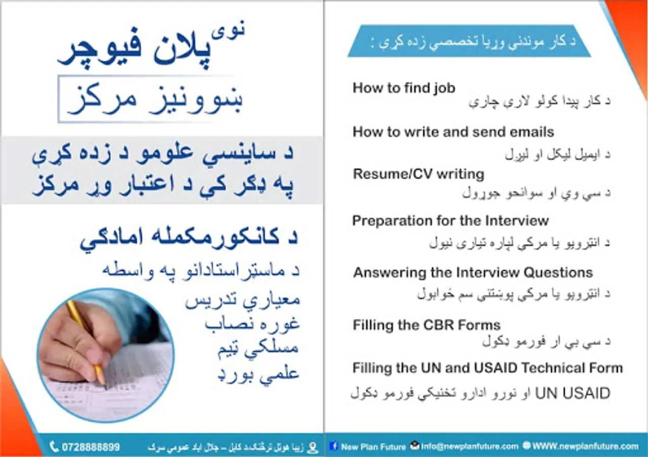 دنوی پلان فیوچر خدماتي او روزنیز مرکز بنسټ په ۲۰۱۶ کال کې د یو مسلکي او تخنیکي ټیم په واسطه کېښودل شو، چې په مشخصه توګه د غونډو او کنفرانسونو په مدیریت، د مسلکي او تخصصي زده کړو لنډمهاله پروګرامونه، د انګلیسي ژبې، کمپیوټر او کانکور امادګي پروګرامونو تدریس او ځوانانو ته د کارموندنې وړیا زده کړو په برخو کې فعالیت کوي.