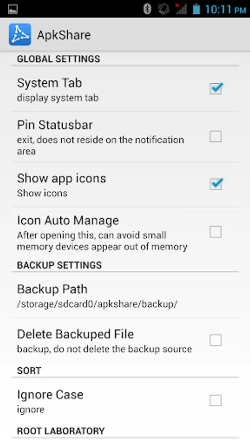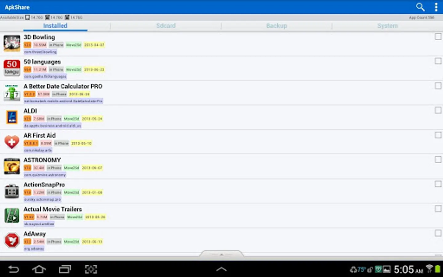 * Backup: Support installation package backup of App programs. App programs package installed can be backup in the storage card. The default location is / sdcard / apkshare / backup. Backup location can be modified by setting. Documents backup can be sent to your friends through various ways or other devices for installation.