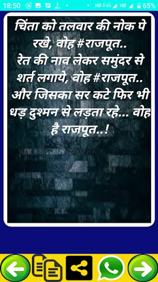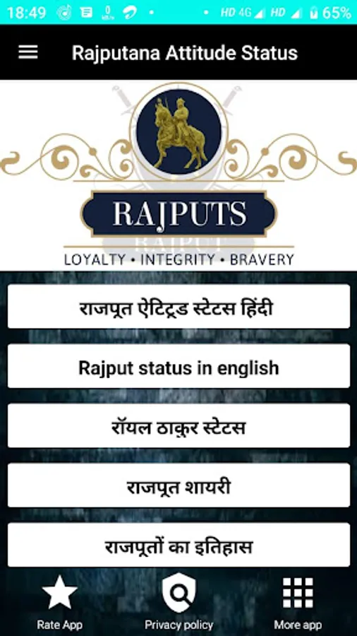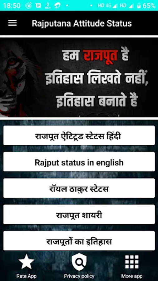 you will find so many status related to rajput in this app like rajput status in hindi , rajput shayari in hindi 2023, chauhan status and thakur status shayri in hindi and english and many more like rajputo ka itihas ,rajput shayri 2 line and hariyanvi rajput status in hindi .i hope you will like all the status and shayri related to rajput in hindi and english both . thank you .