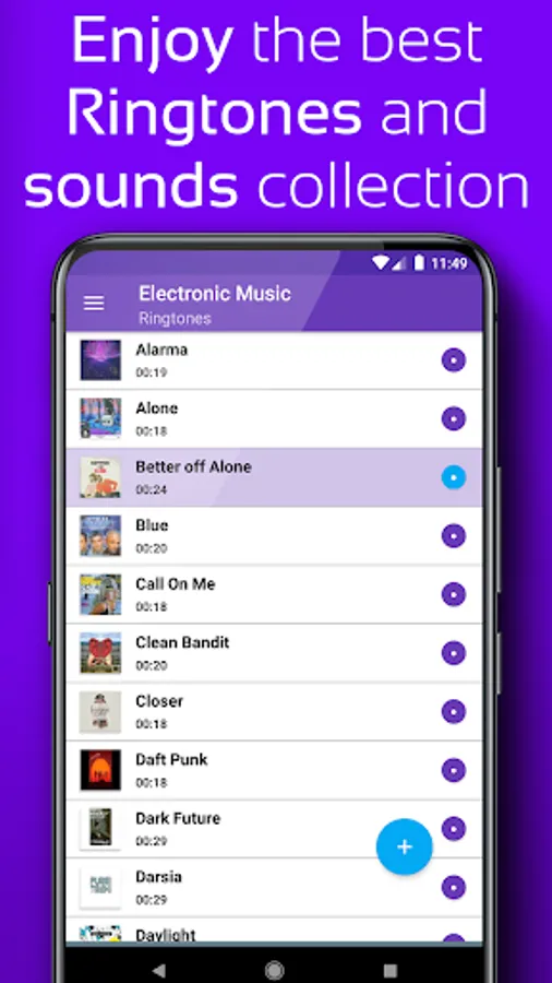 In the new electronic app ringtone you can download the best songs from the electronic sound track: Blue, A city in Florida, Foam, Call on me, Afrodisiak, Hey brother, Lovers on, Played a live, Silence, The specter, Summer, I could be the one, Alone and much more.