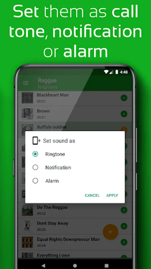 This app contains a compilation of the best reggae music with the best free ringtones for Android phones. All sounds and songs have been selected personally so you can download the best collection of Reggae music ringtones for the phone, which you can set as call ringtone, alarm sound, message tone or notification tone.