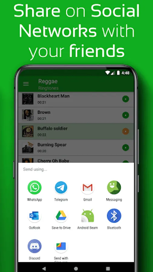 In this free reggae music ringtones app, you will download the best top hit songs in 2019 in the voices of the singers: Bob Marley, Peter Tosh, Jimmy Cliff, Gregory Isaacs, Dennis Brown, Alton Ellis, among others. With this Reggae Ringtones Downloader, you can get all reggae music songs for your Android phone for free and set them as a text message ringtone, notification sounds, WhatsApp ringtone, alarm sound or ringtone. call.