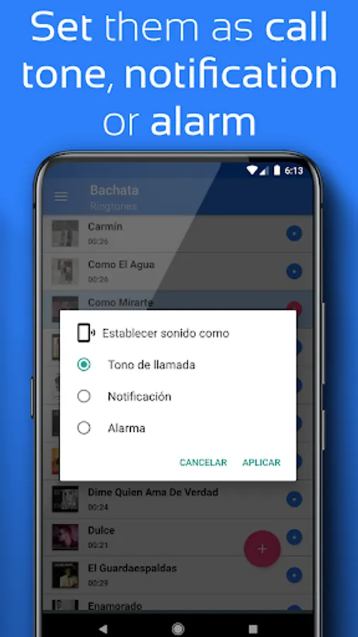 With this bachatas musics tones downloader you can download the file in mp3, share the sounds on WhatsApp and social networks or set your favorite song on your android phone as ringtone for call, message ringtones, text tones, notification sound, alarm tone or WhatsApp tone. You won't be able to listen ringtones offline without internet or wifi since it is necessary to download the mp3 file. When tunes to the ringtone, it will be paused to play the ring tone or cell phone ring tones when entering a call.