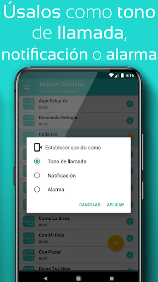 With this Christian music ringtone downloader you can download the mp3 file, share the sounds on WhatsApp and social networks or set your favorite song on your Android phone as a ringtone for calls, message tones, text tones, notification sound, ringtone. alarm or tone for WhatsApp. You can't listen to the ringtones offline, without Internet or Wi-Fi, because you need to download the mp3 files. When you play the ringtone, it will stop to play the ringtones or cell phone ringtones when a call comes in.