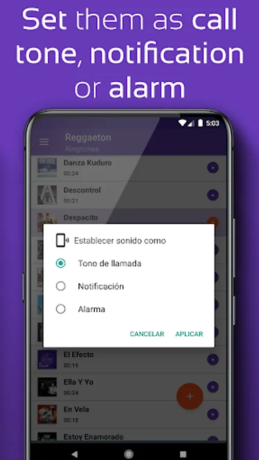 With this reggaeton tones downloader you can download the file in mp3, share the sounds on WhatsApp and social networks or set your favorite song on your android phone as ringtone for call, message ringtones, text tones, notification sound, alarm tone or WhatsApp tone. You won't be able to listen ringtones offline without internet or wifi since it is necessary to download the mp3 streams. When tunes to the ringtone, it will be paused to play the ringtones or cell phone ring tones when entering a call.