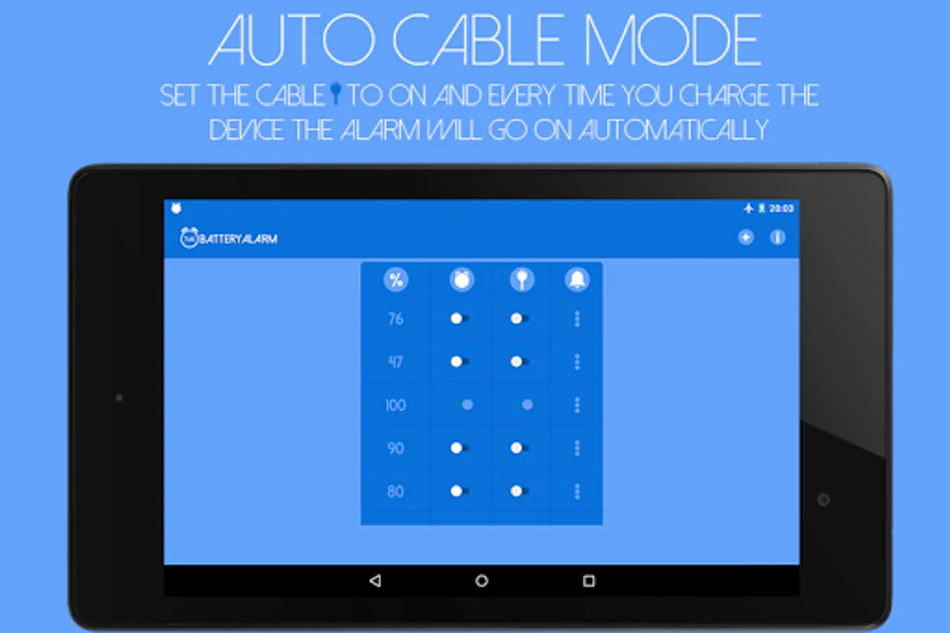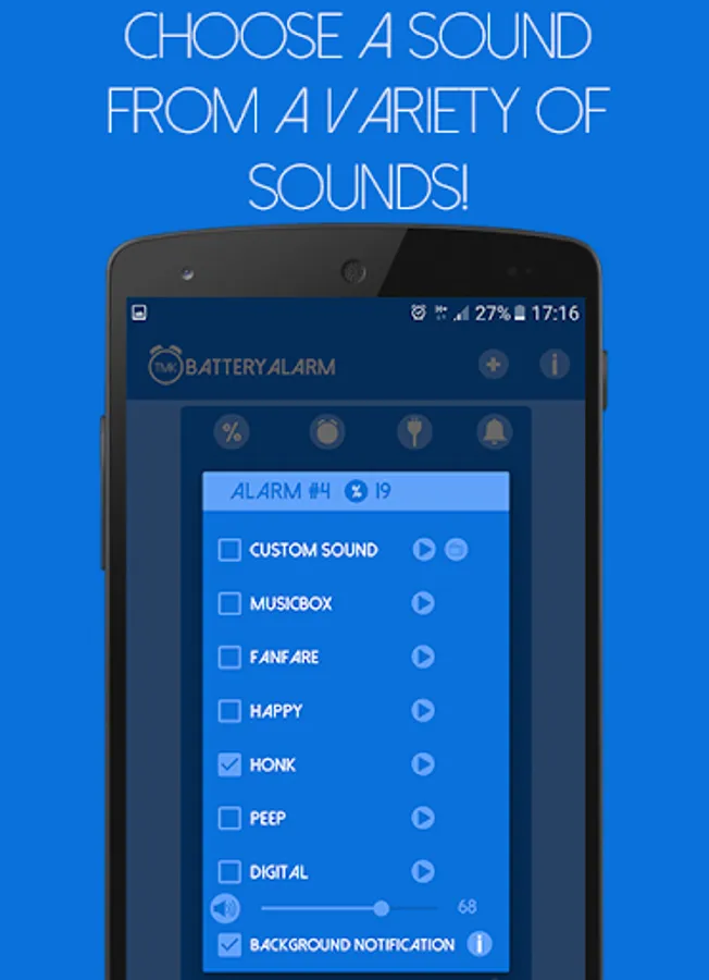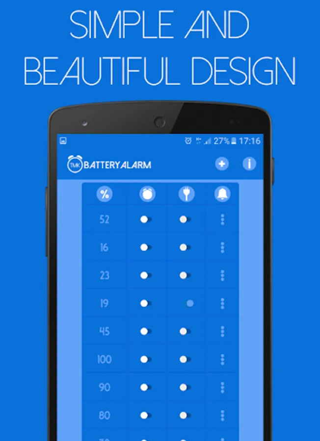 A professional Battery Alarm, that can notify you when the battery has reached a certain percent (%).