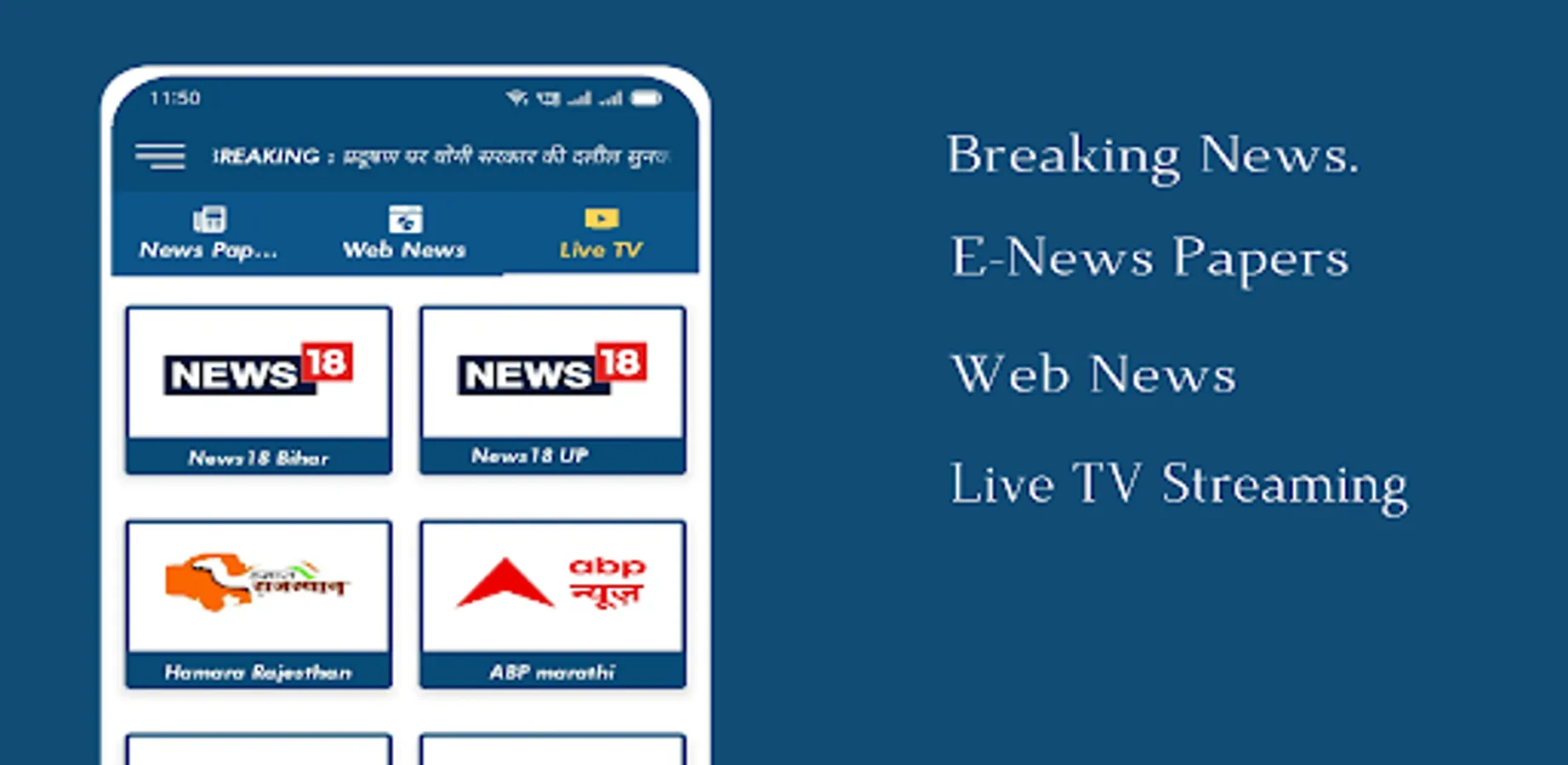 This app brings you the best collection of news channel and Live news in Hindi for 2021. Watch your favorite news anchor with this prestigious all Hindi Live TV channel app. Free news app brings to you Live TV, latest news in Hindi (हिंदी समाचार), breaking news, news alerts (ताज़ा हिन्दी खबर), national news, international news (अन्तर्राष्ट्रीय समाचार), local news, news from all states, sport news (खेल समाचार), Bollywood News, news from politics, crime news and religion news (धर्म). Breaking News in Hindi is India's most-watched and most trusted Hindi news source. Download the latest News In Hindi app on your Smart phone and watch all Hindi news channel Live and major Hindi news debates, TV shows. Watch all the latest and Live Hindi news on Hindi News Live TV.
