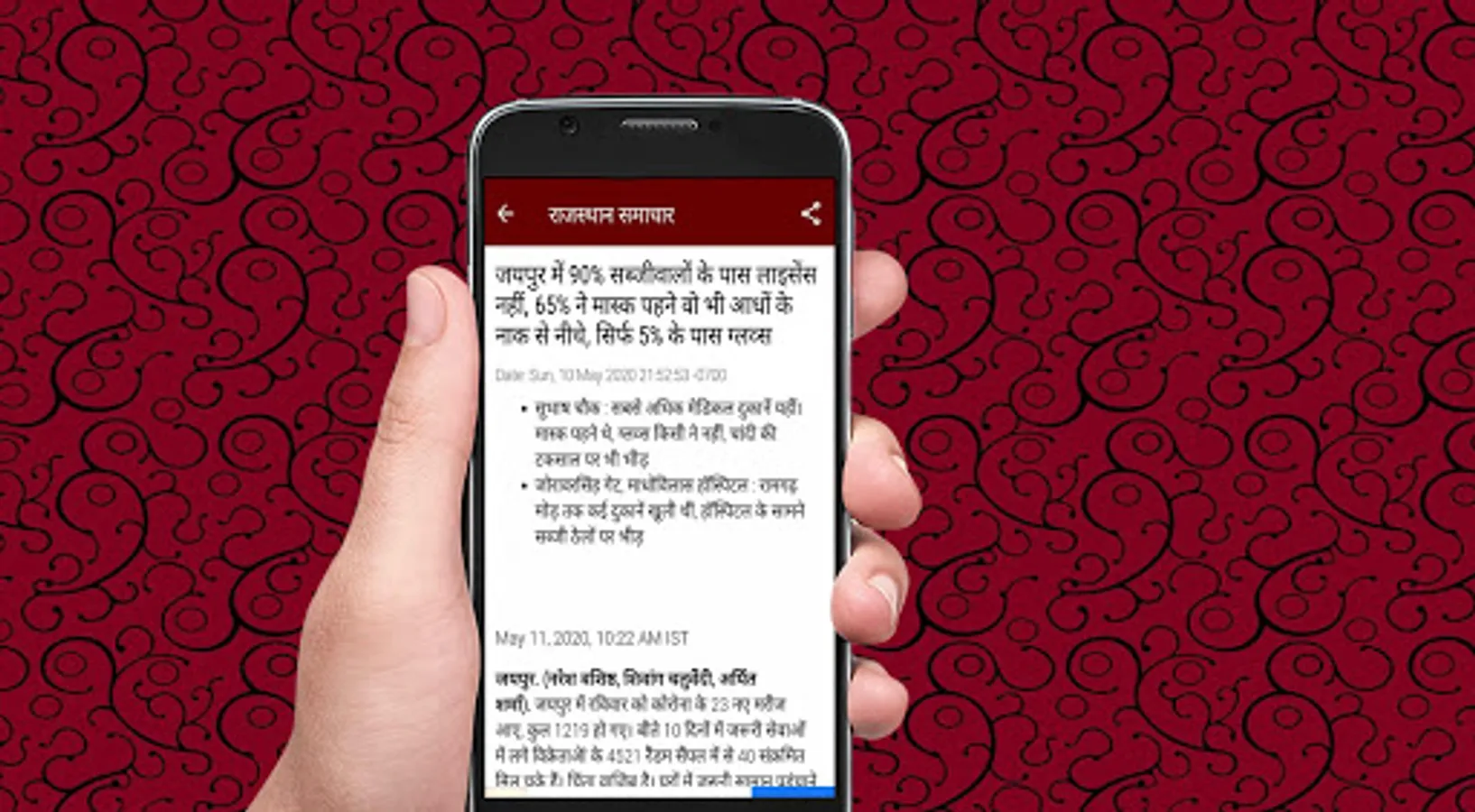 Rajasthan Hindi News is an Android application to get the latest and breaking news of Rajasthan in Hindi from your favourite newspapers & TV Channels websites. Explore Rajasthan happening topics like, culture, business, politics, sports & more from Rajasthan Dainik Bhaskar.