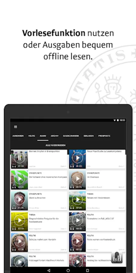 With our reading function, you can have individual articles or entire issues read to you. Once loaded, issues are saved and can also be read without an internet connection.