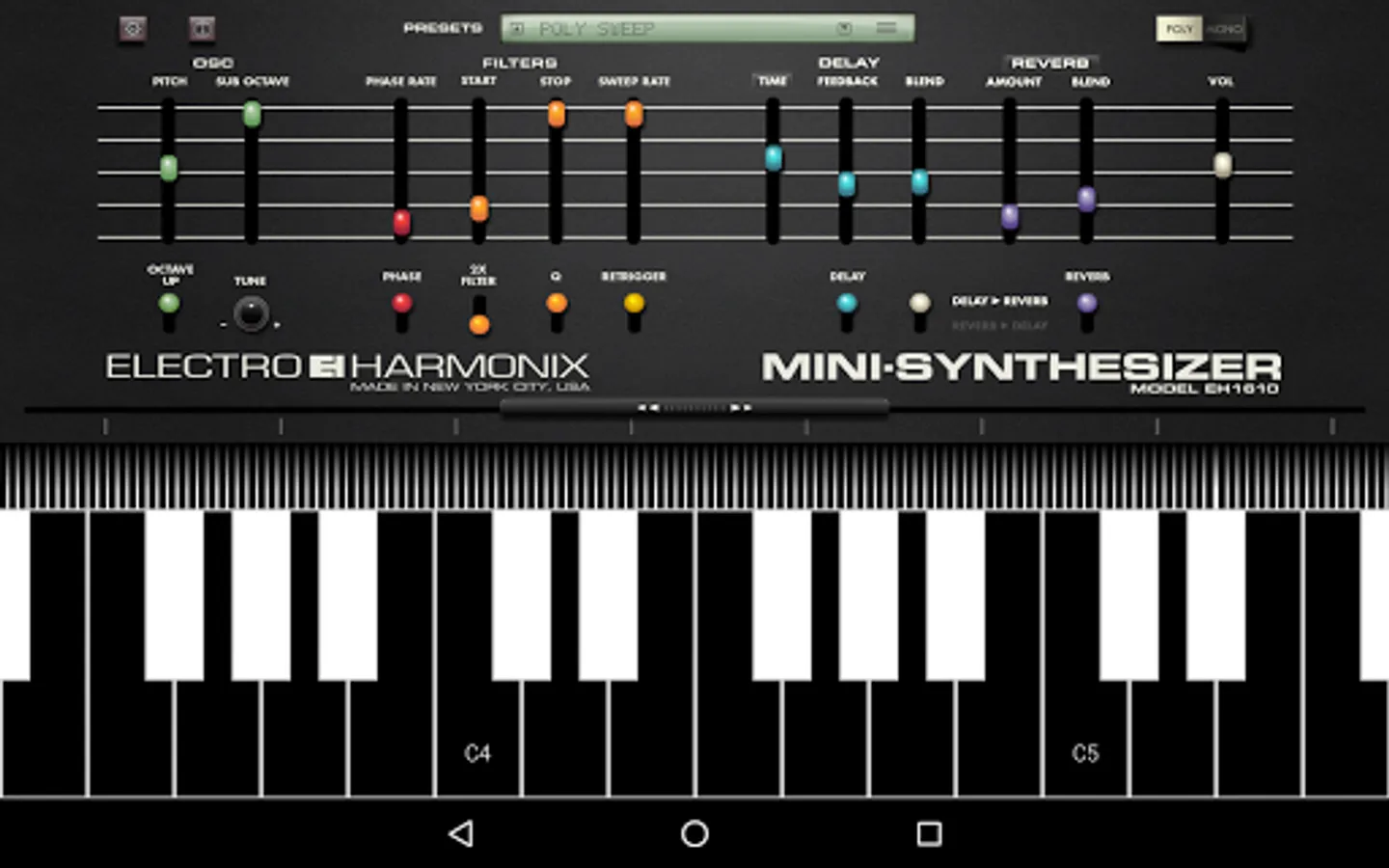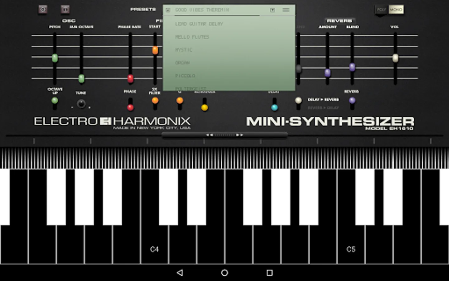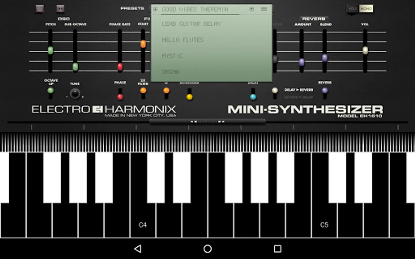 The easy-to-use Electro-Harmonix MINI-SYNTHESIZER App is loaded with great sounds and features and is sure to appeal to serious musicians and non-musicians alike.