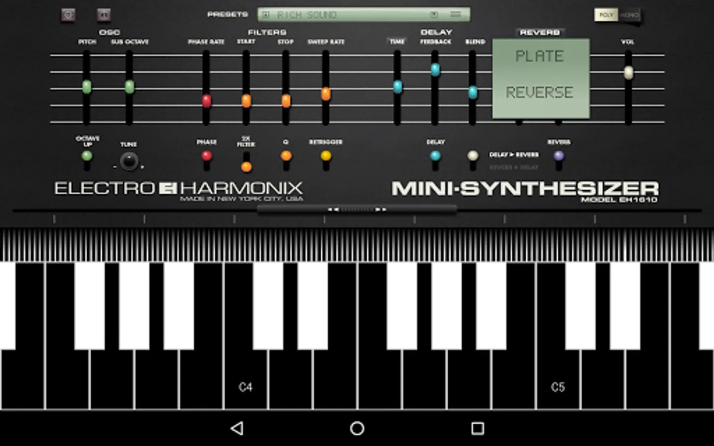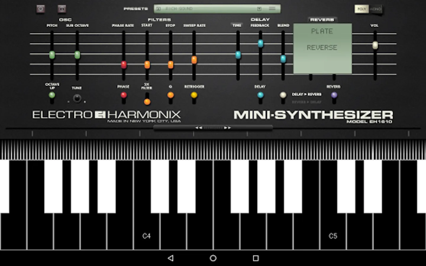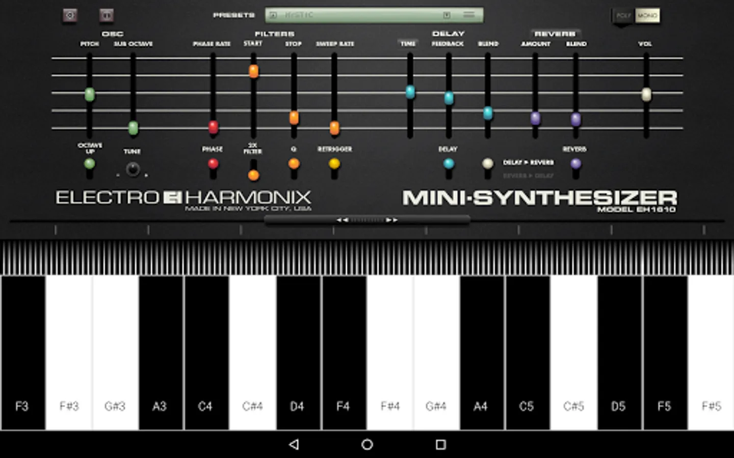 The easy-to-use Electro-Harmonix MINI-SYNTHESIZER App is loaded with great sounds and features and is sure to appeal to serious musicians and non-musicians alike.