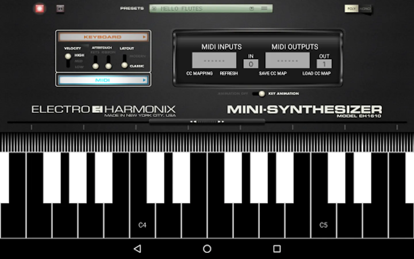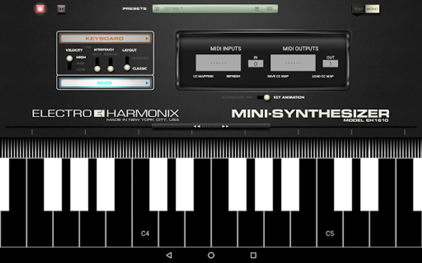 The MINI-SYNTHESIZER app comes with 25 presets and the ability to store an almost unlimited number of user presets programs. MIDI input, output, and MIDI CC Mapping preset loading and saving capabilities are included as well as Aftertouch for all tablets.