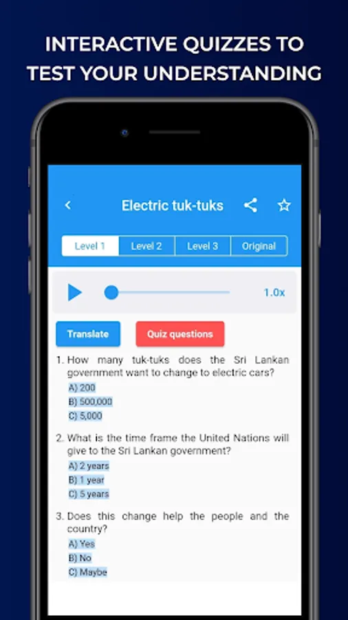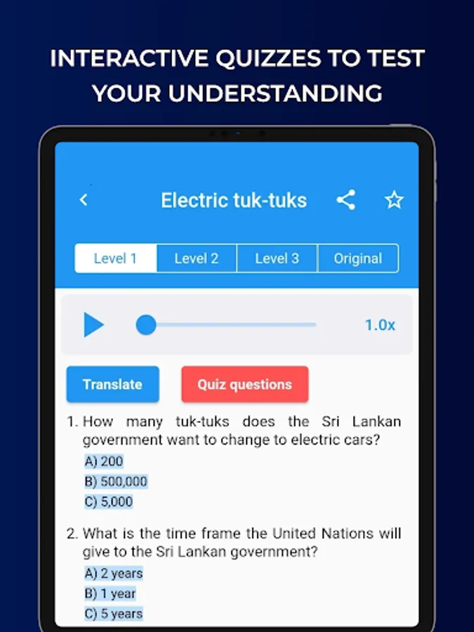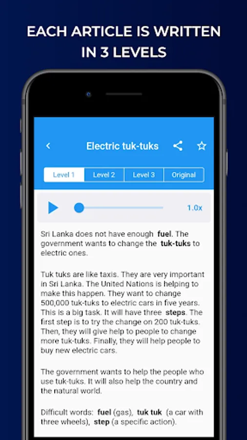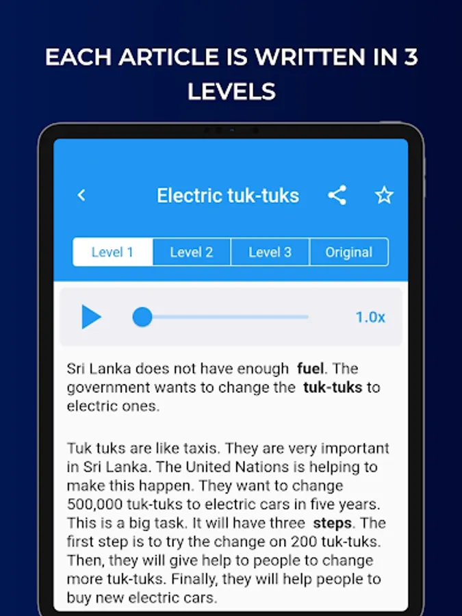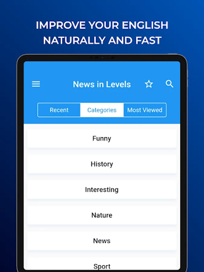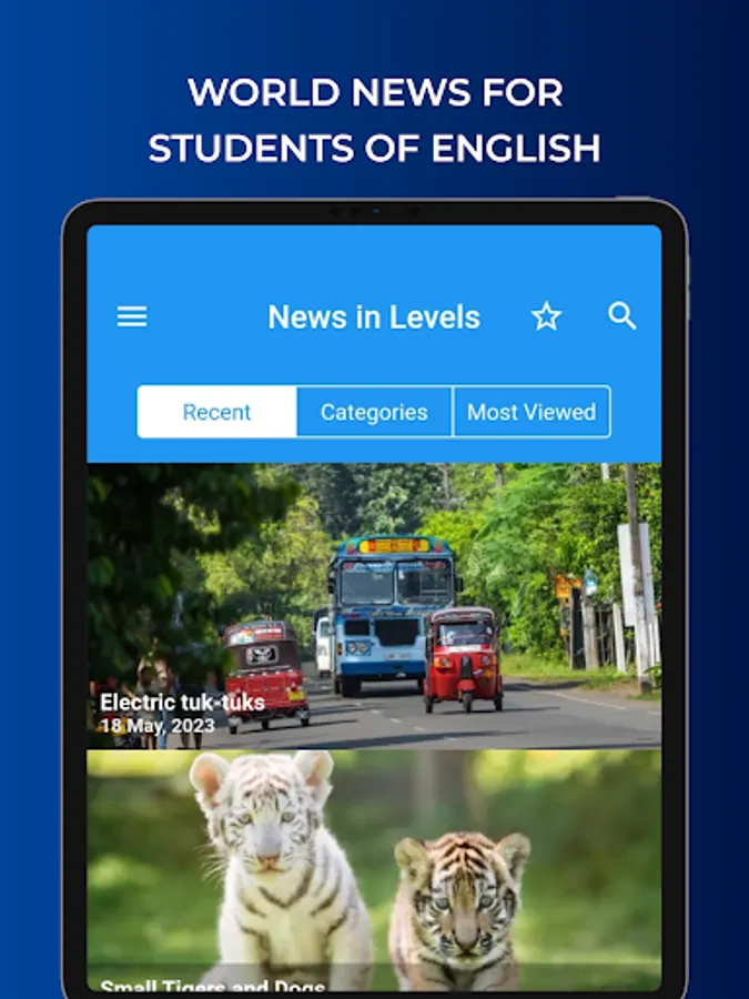 News in Levels is an application to improve your English naturally and fast with our articles. In our short news, we use words which are used in English often.