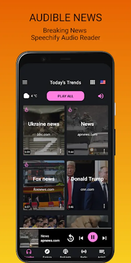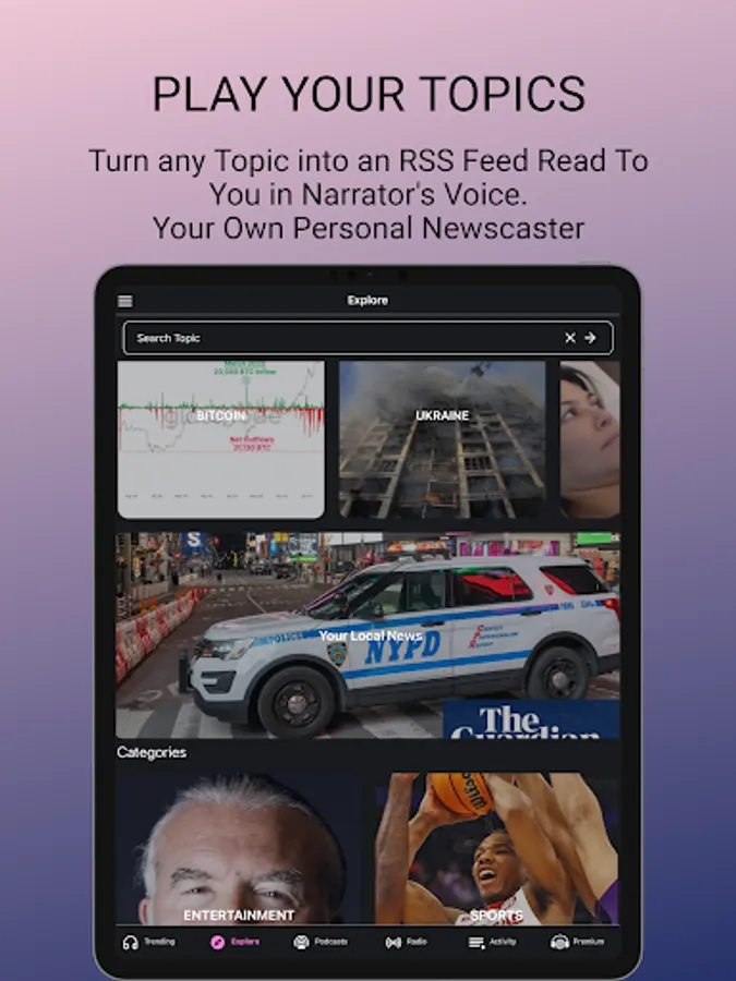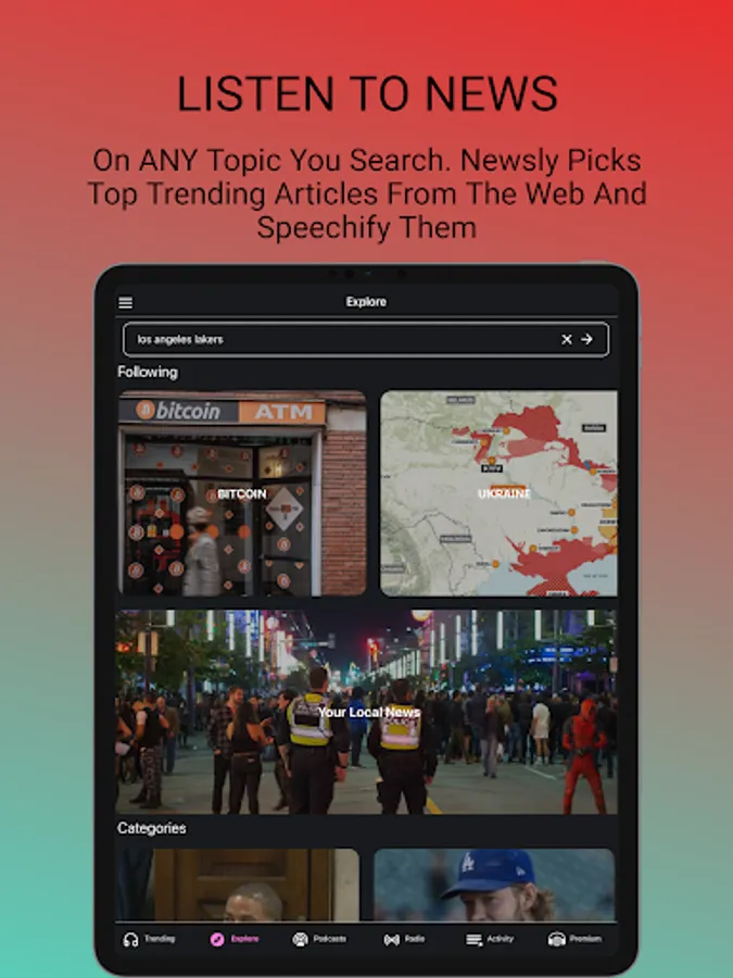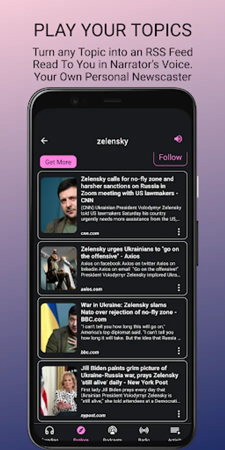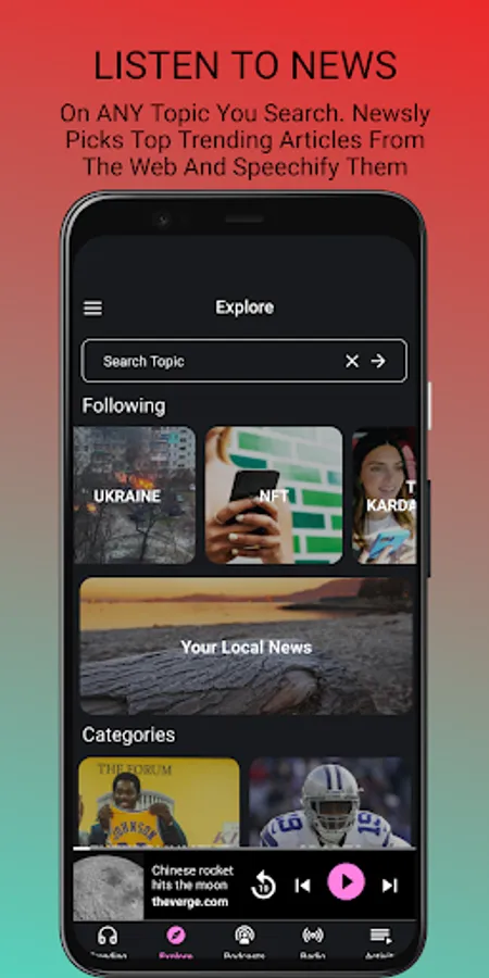 Listen to the news now! Breaking news, audible news, about popular trending topics from global news trends or local news from the web. Whatever your anchor for the news is be it BBC News, ABC News, Associated Press, Vox, Reddit or NPR. Just click on the articles from the Trending tab, or from the Explore pre-defined categories like Ukraine, Science, World News, Sports, Business, Entertainment, Technology, Crypto. They are all free to listen to on the Newsly headliner app. But the uniqueness of the app is that you can create with one tap and a blink of your eyes an RSS Feed on topics you define. Get smarter by creating this smarter news web RSS player. E.g. if you put on the Explore tab the term “Science companies in California” you can follow it, and every time there is an article about it tap it, and it will be read aloud in English. The perfect time saver! Yes, it is a text to speech, but this is a natural reader vox. You can improve your English by listening to topical trending articles personalized to your interest. Doesn’t matter if you are still learning the ABC or English it is your first language You can read it as well, on the in-app browser, or put on your headphones, relax and rest your eyes. Don’t hesitate to blink, you will hear it while it is played. This is your way to make headway.
