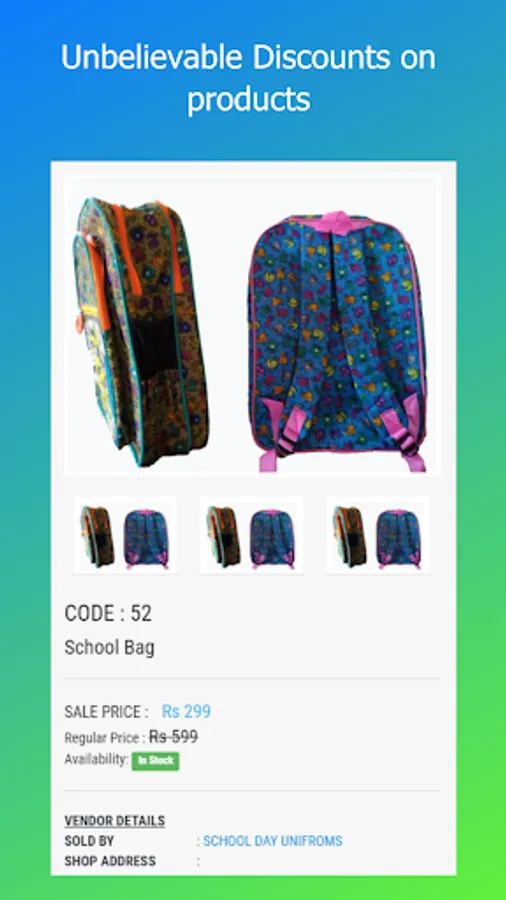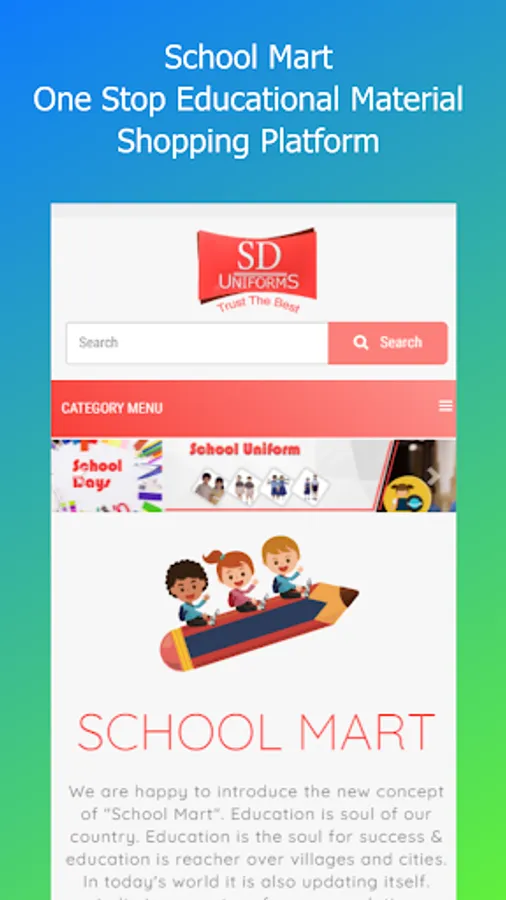 In modern days, online shopping gives buyers flexibility to buy their requirements on a click which saves the time. The combination of traditional and modern shopping is essence of schoolmart.com and School Mart App, buy things from the seller whom you know. This gives the satisfaction of shopping as well as assurance of the products you buy. Our idea is to provide a single platform for buyer to purchase all educational products on tap.