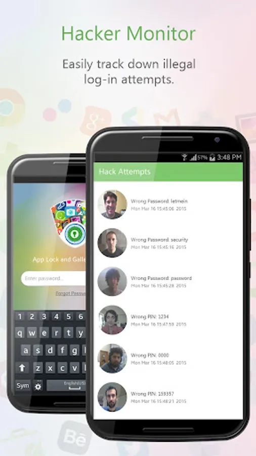 When someone tries to sneak into your phone and access your personal stuff, App Lock immediately captures an image of that person and records it along with the wrong password he entered and the time when he entered it.