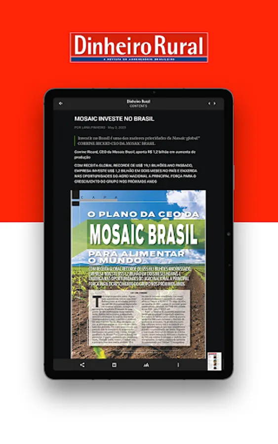 Receive Rural Money directly on your Tablet or Cell Phone. The best Brazilian agribusiness magazine offers you exclusive reports on topics related to business, economics, finance, technology and style in the field.