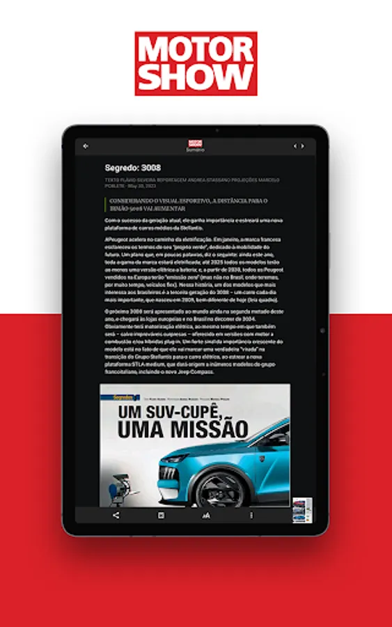 Motor Show is an essential magazine for those who love cars and want to make the best deal to buy or sell their car. In addition to coverage of launches with evaluations always written in everyday and accessible language, the magazine brings industry secrets, coverage of international fairs, competition news, travel tips, interviews, exclusive reports and articles from the Italian magazine Quattroruote.