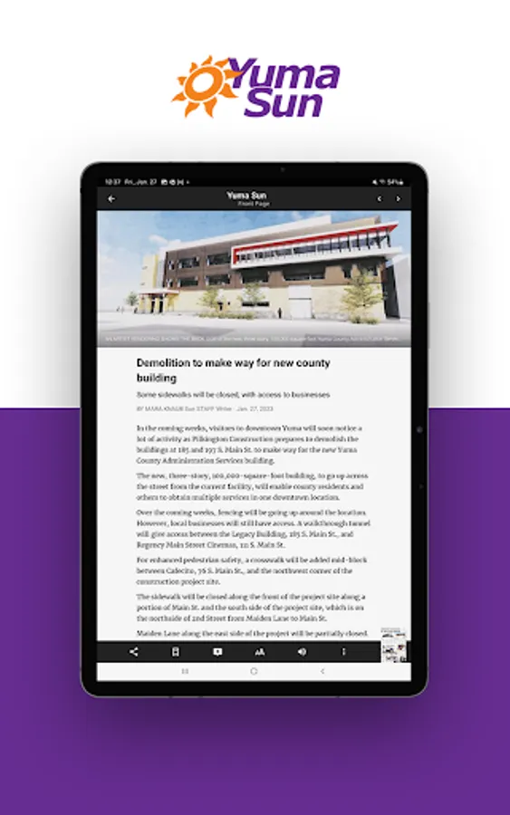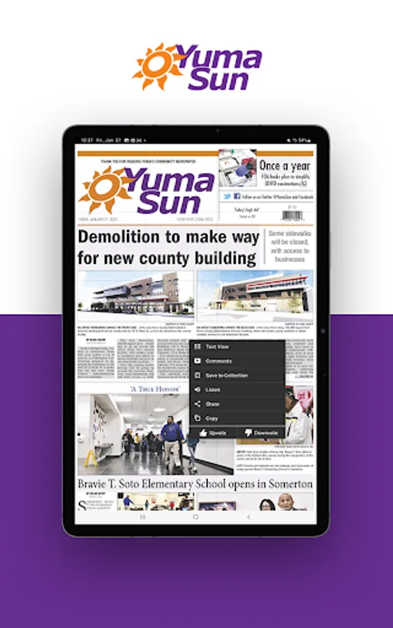 The Yuma Sun app keeps you up-to-date on local Yuma County news wherever you go. Enjoy the digital features of our e-edition like social sharing to Facebook and Twitter. When you need to be offline, just download the edition to your device and save for later. Get in-depth coverage on local, regional, and national news, sports, business, lifestyle, and more straight to your phone or tablet.
