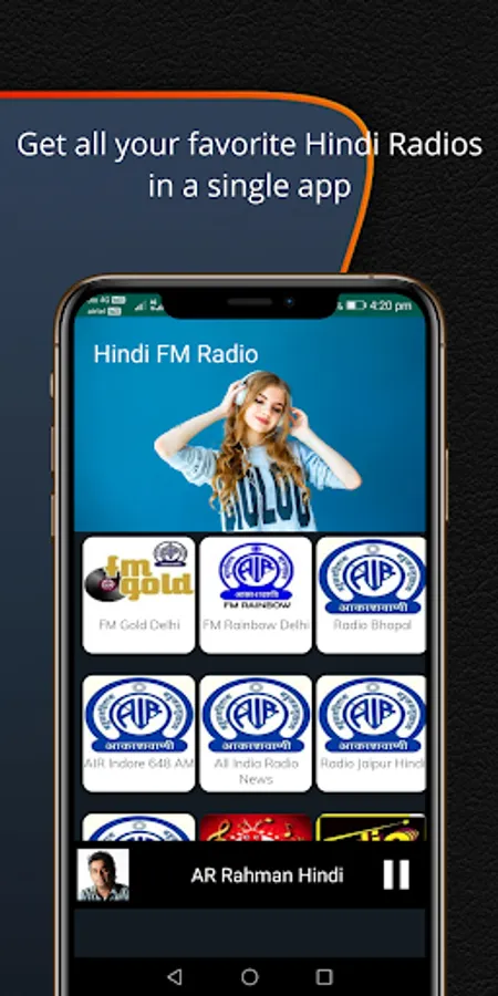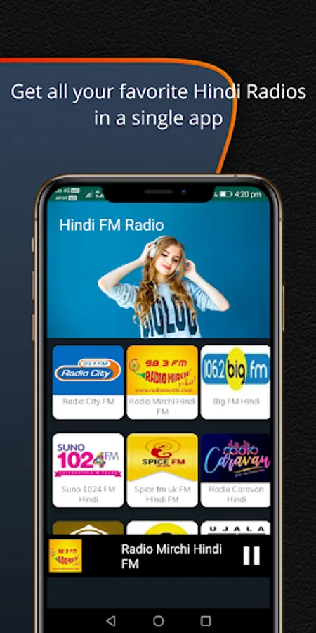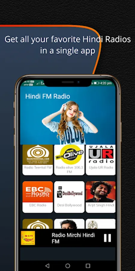 Online Radio Hindi app helps you to listen more than 100 Fm radio station from anywhere in the world. Now listen you native FM radio by using our app for absolutely free. Now you can listen Fm radio without using head phones.