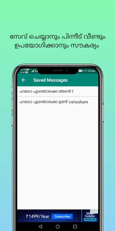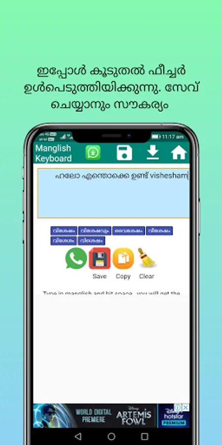 This Manglish keyboard helps to type your messages in Malayalam and save it in your app itself. Can share the message at anytime and edit in future.