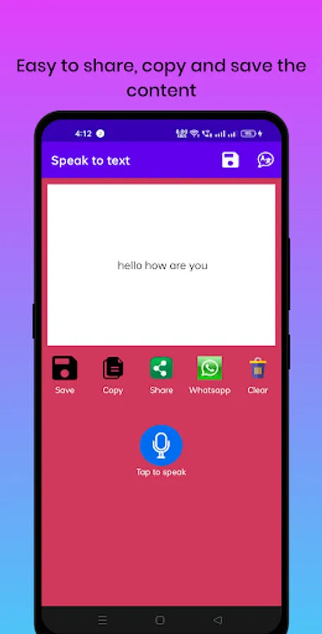 After the spoken content was written in the text field automatically, you can save, copy, share or directly share to social media application with the button provided.
