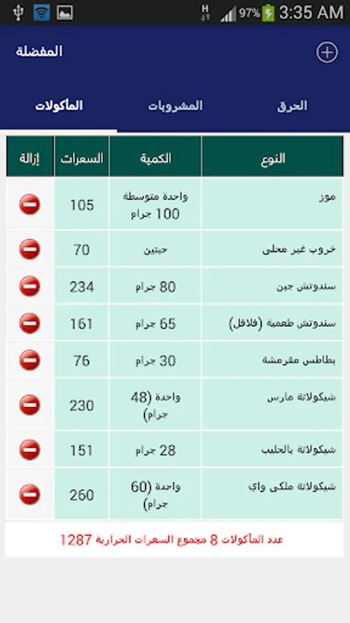 * You can add Mufdilh- food or drinks or sports activities add an item to your favorites and the introduction of its own values or calorie tables. At the bottom of each table in a favorite among the elements and total calories appears.