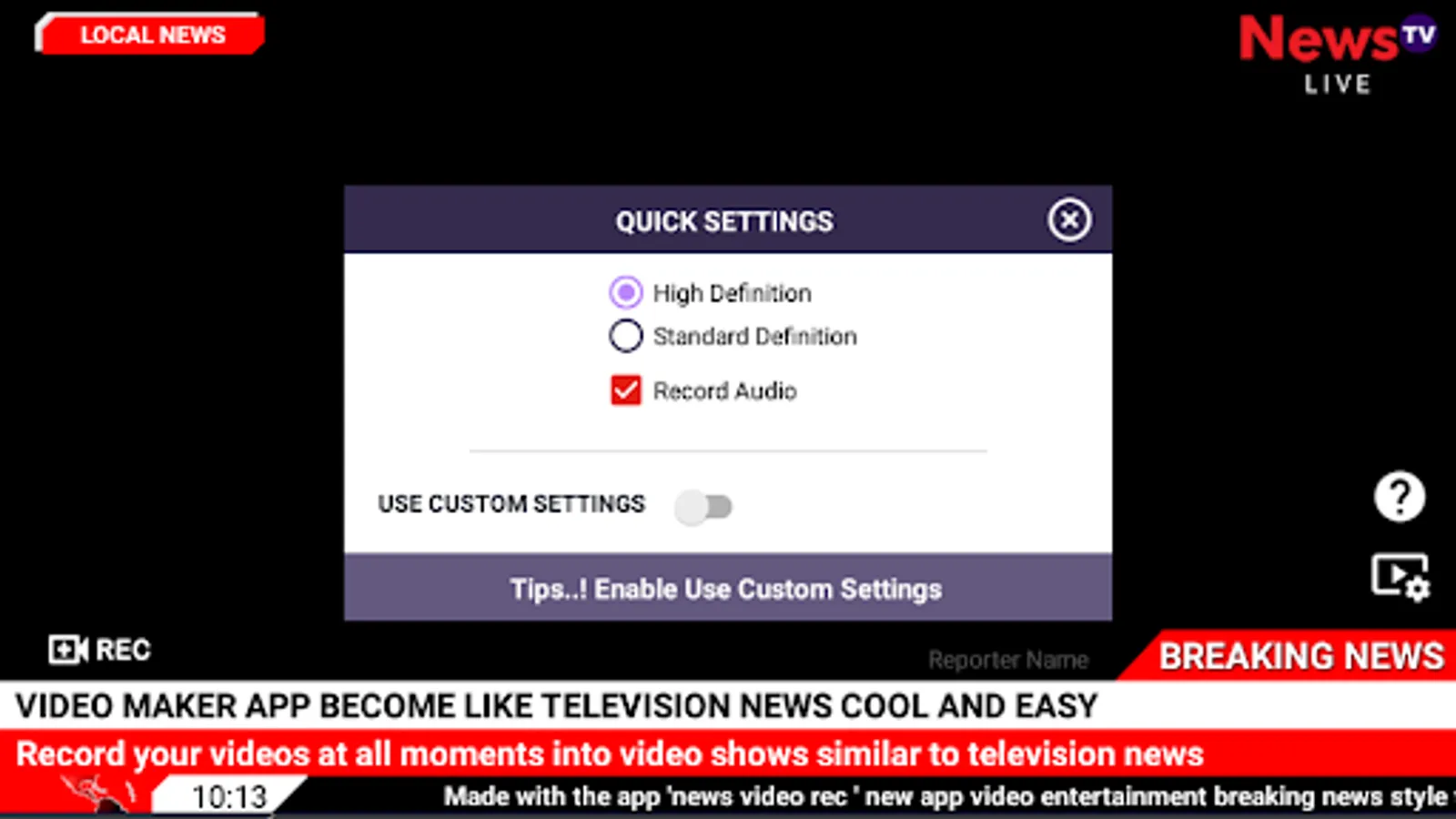 The app "Reporter Rec News" is funny, unique, and simple to use. All you have to do is use the camera and add some pictures or text to give the photo a title. This breaking news photo video media editor app also makes a real news-style video with a running text display. Your friends will be truly enthralled and perplexed by your actions.