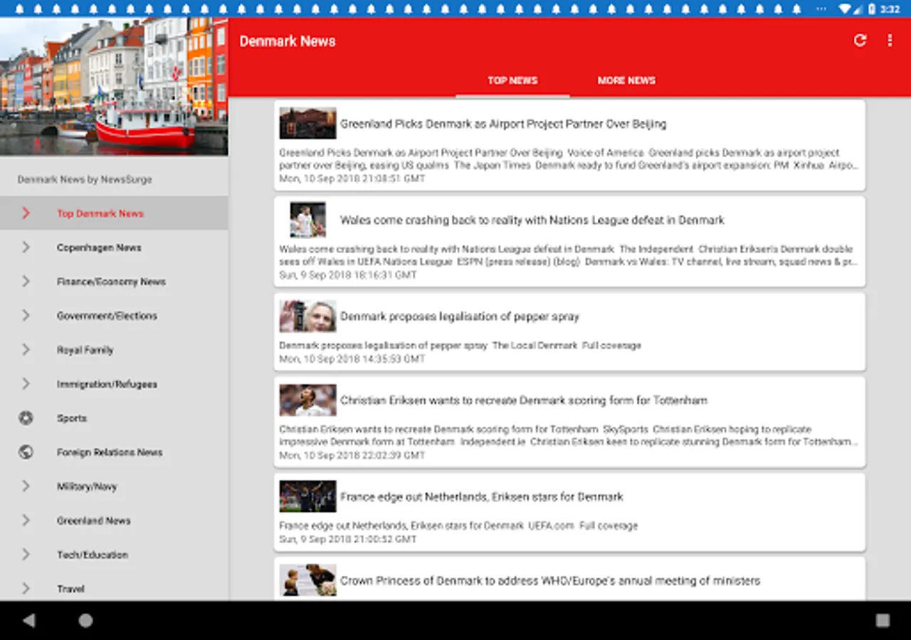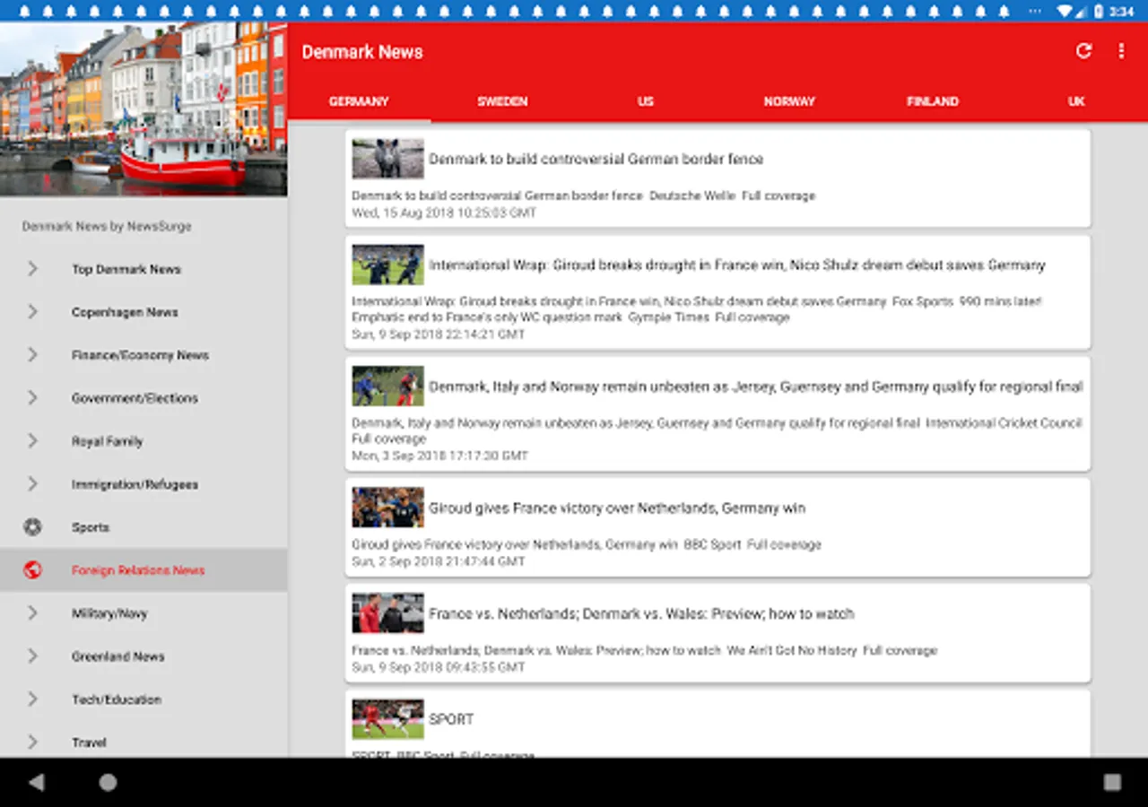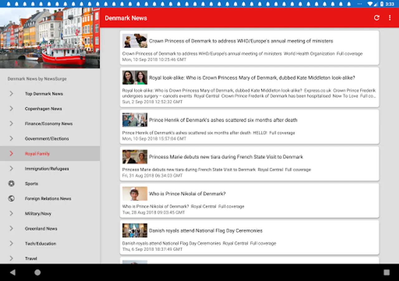 Latest Denmark News in English today at your fingertips, with notifications support (You can change notification preferences in the Settings section of your Android Device)! Get breaking Denmark news including updates on the economy, immigration/refugees situation, travel, sports technology, plus much more. Individual news sections dedicated to top cities Copenhagen, Aarhus, Odense and others will keep you informed about local news happenings.