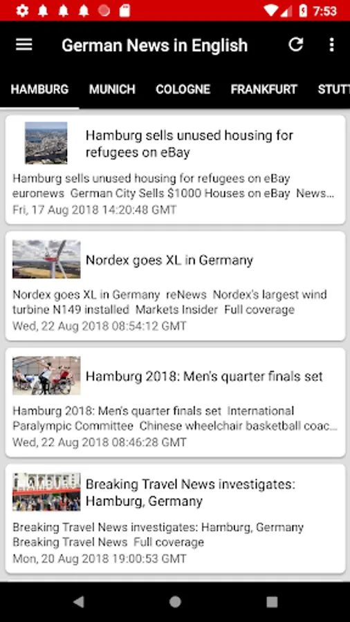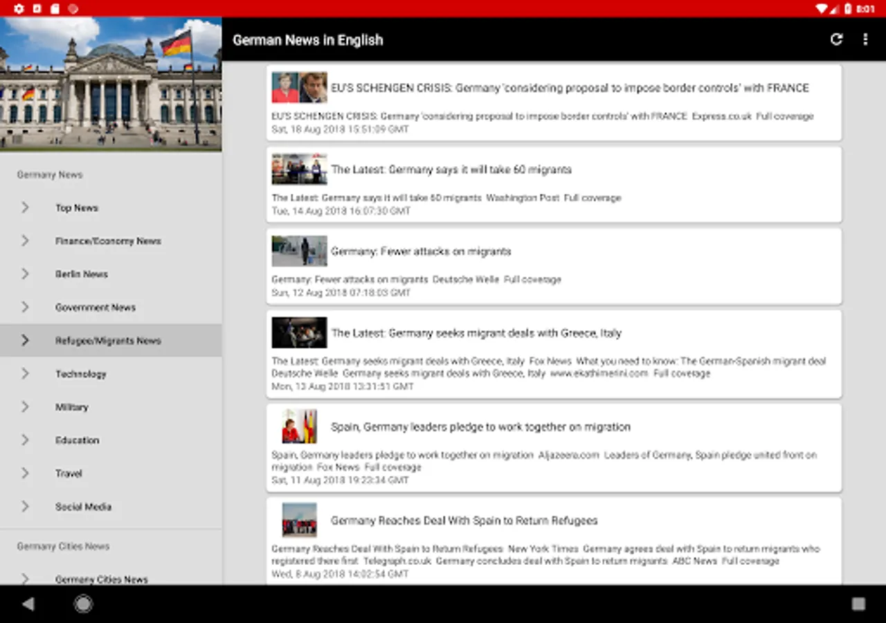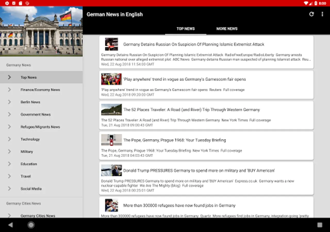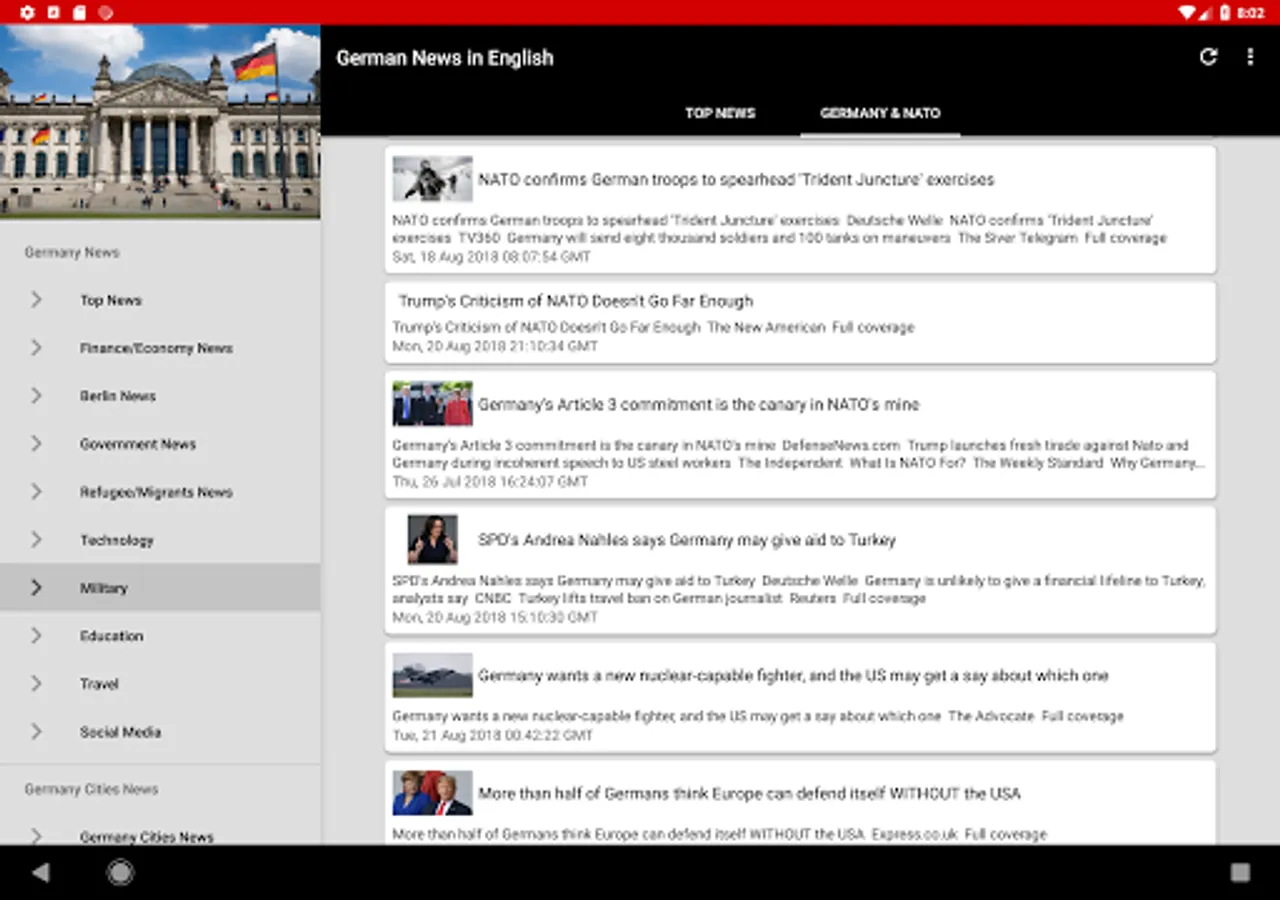 Breaking German News in English Today at your fingertips, with notifications support! Get the latest Germany News including updates on the refugees/migrants situation, sports, economy, education, banking, technology, elections, NATO/military, international relations and more. Individual news sections dedicated to top cities Berlin, Hamburg, Munich, Cologne, Frankfurt and more will keep you informed about local news happenings there. There is also a business section to keep you up to date on the top German companies including Allianz, Daimler Chrysler, Siemens, BMW, BASF, Deutsche Bank and others.