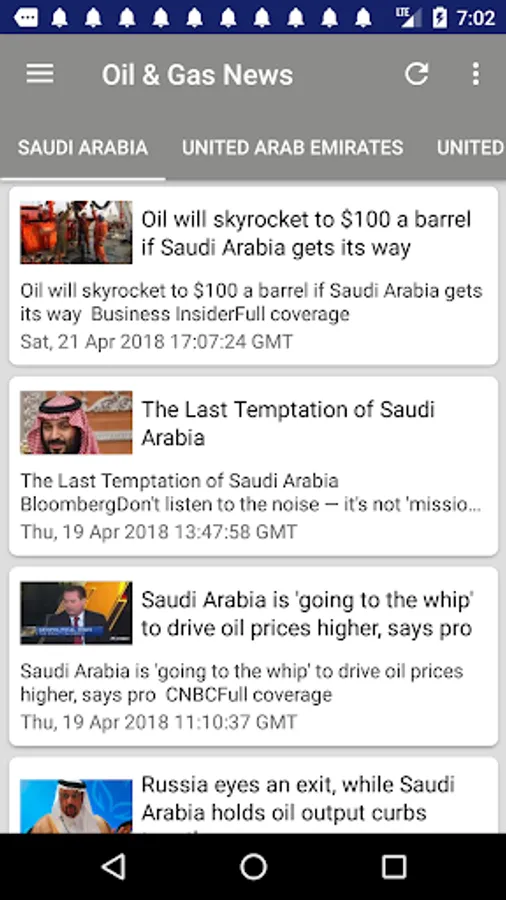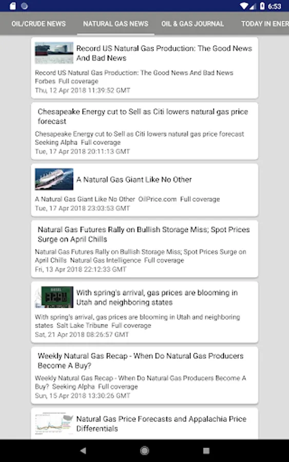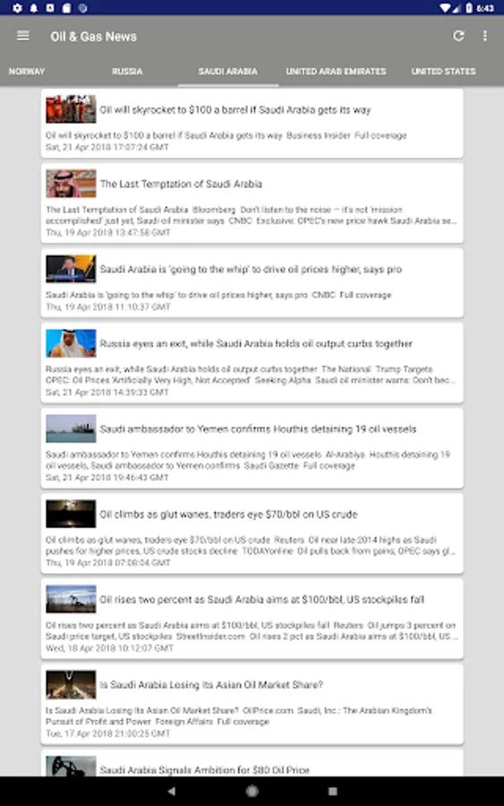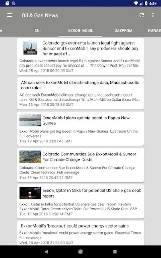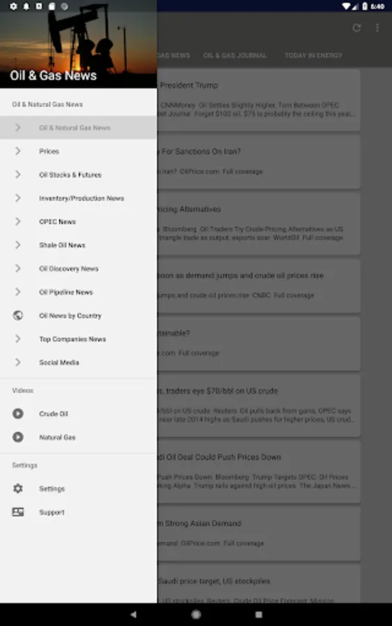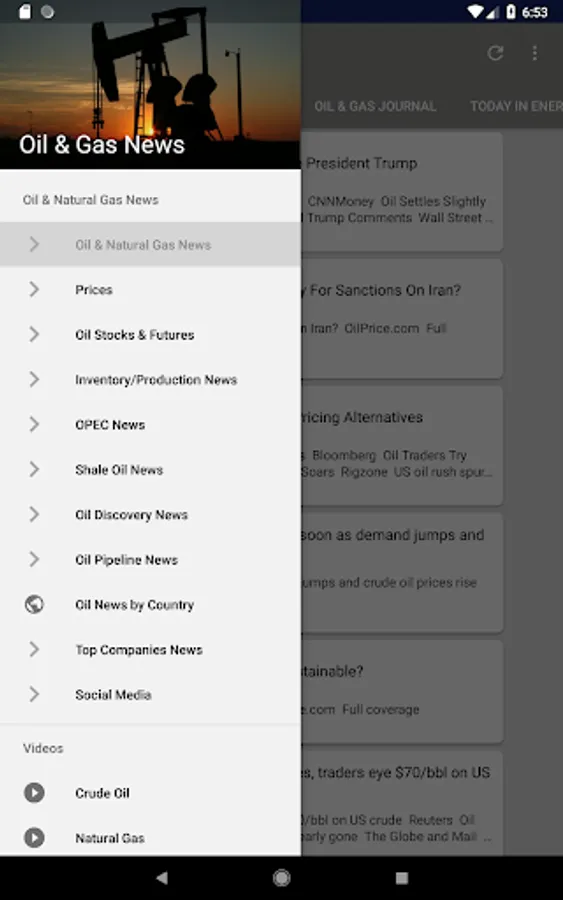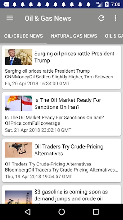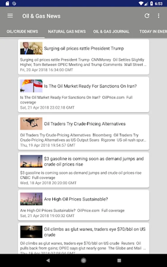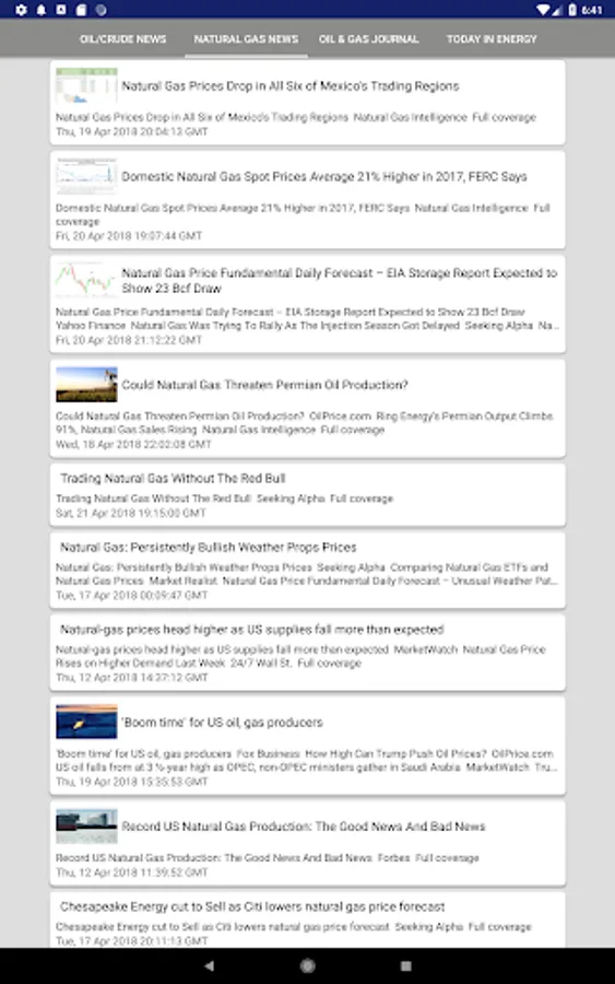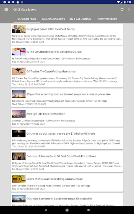 Latest Oil and Gas News Today at your fingertips, with notifications support (You can change notification preferences in the Settings section of your Android Device.) Get the latest crude oil news & natural gas news from the energy industry including updates on pricing, plus updates from OPEC. There are also individual news sections dedicated to top individual oil and gas producers such as Exxon Mobil, Royal Dutch Shell, BP, Valeryo Energy, ConocoPhillips, Chevron, PetroChina, Sinopec, Saudi Aramco, Total SA, Gazprom and more. Also learn with informative and educational videos, including gas-saving tips.