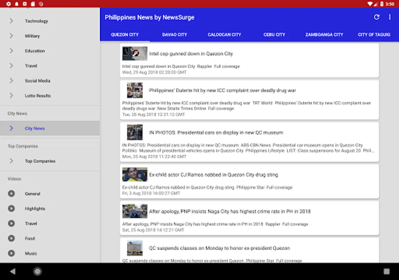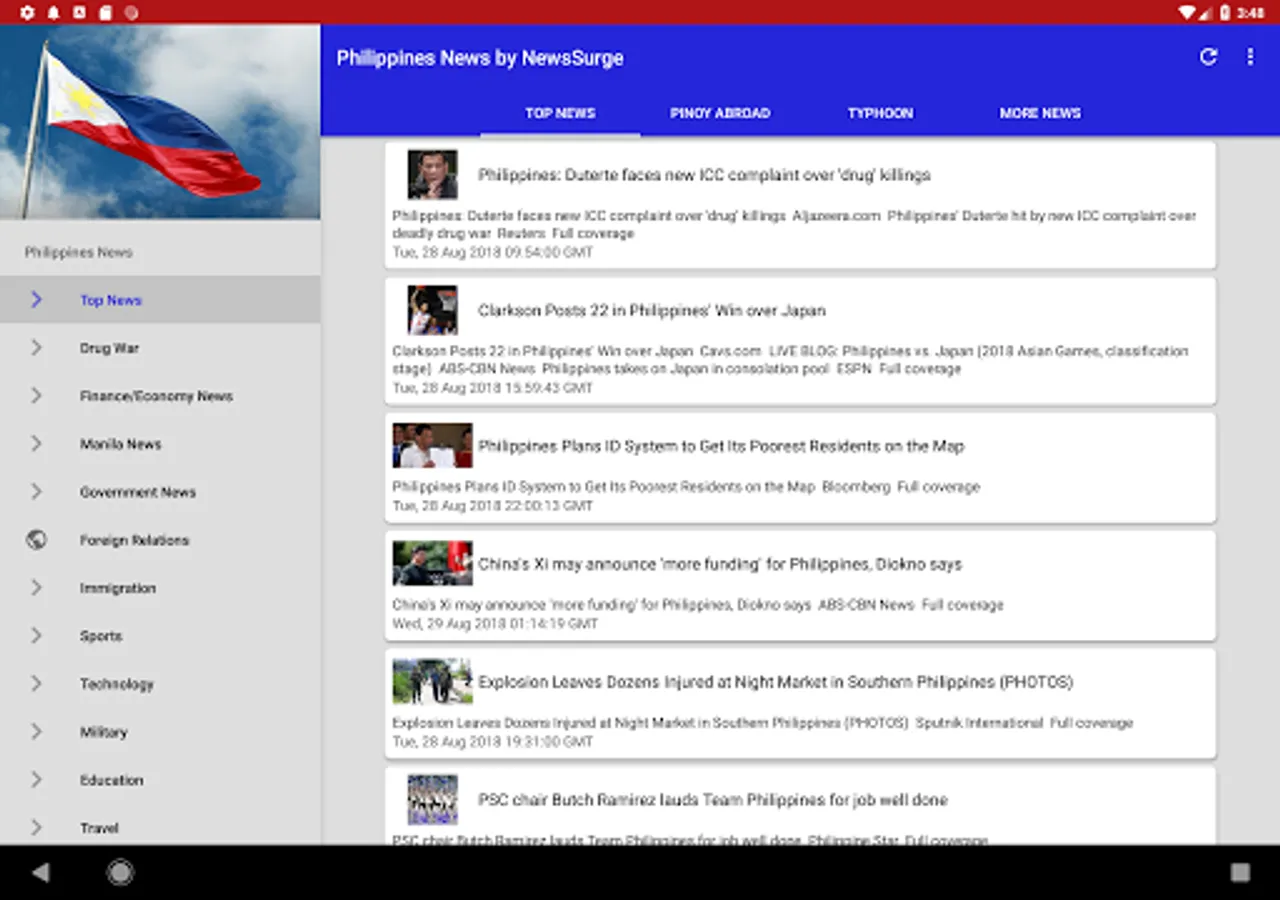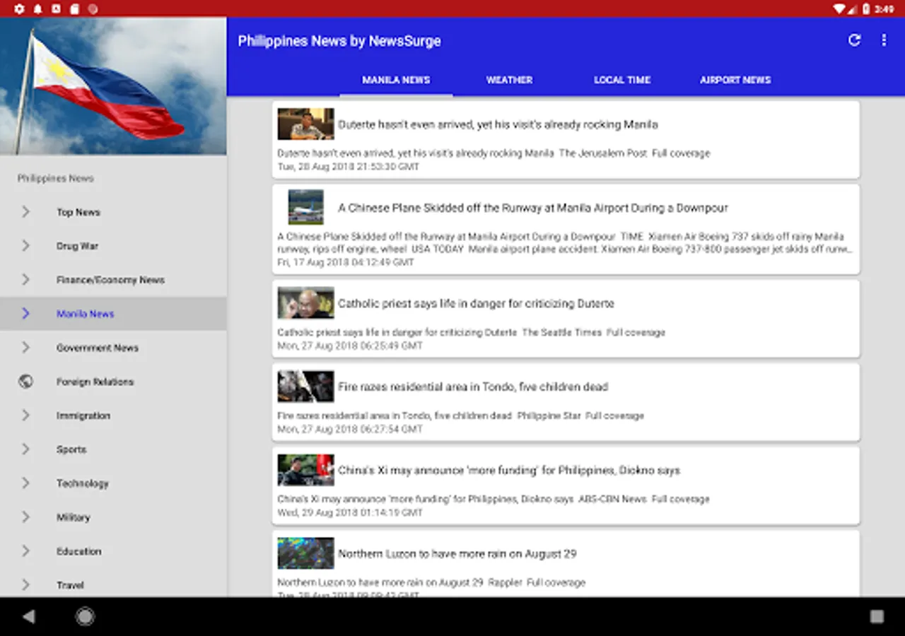 The latest Philippines News & Headlines today at your fingertips, with notifications support (You can change notification preferences in the Settings section of your Android Device)! Get the breaking news on the Philippines Drug War, celebrity updates, sports, typhoon warnings, and more. Individual news sections dedicated to top cities (Quezon City, Manila, Calooncan, etc) and provinces (Capiz, Cebu, Bhol, Palawan & more) will keep you informed about local happenings. News of top companies in the Philippines are also covered including Manulife Financial, BDO Unibank, Ayala and others.