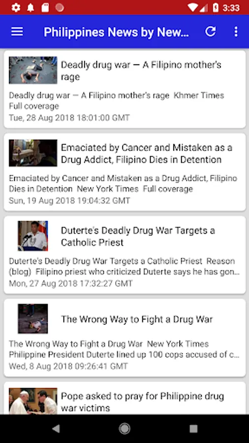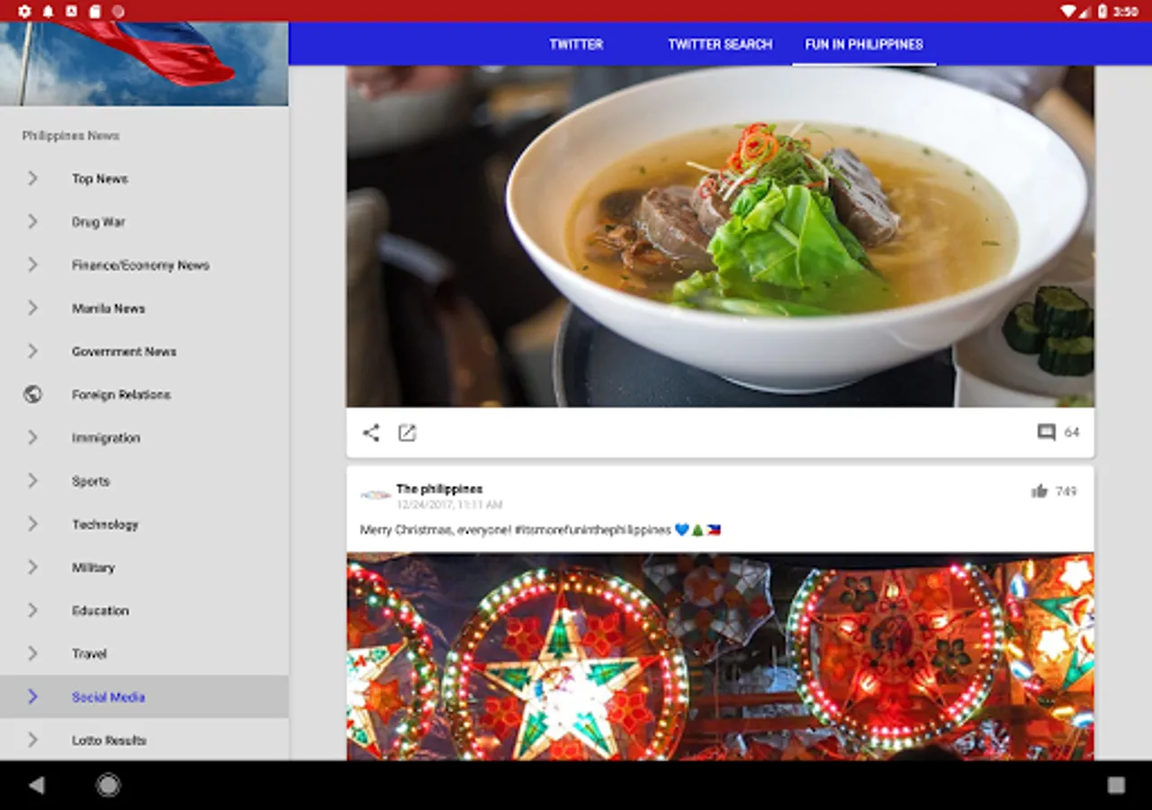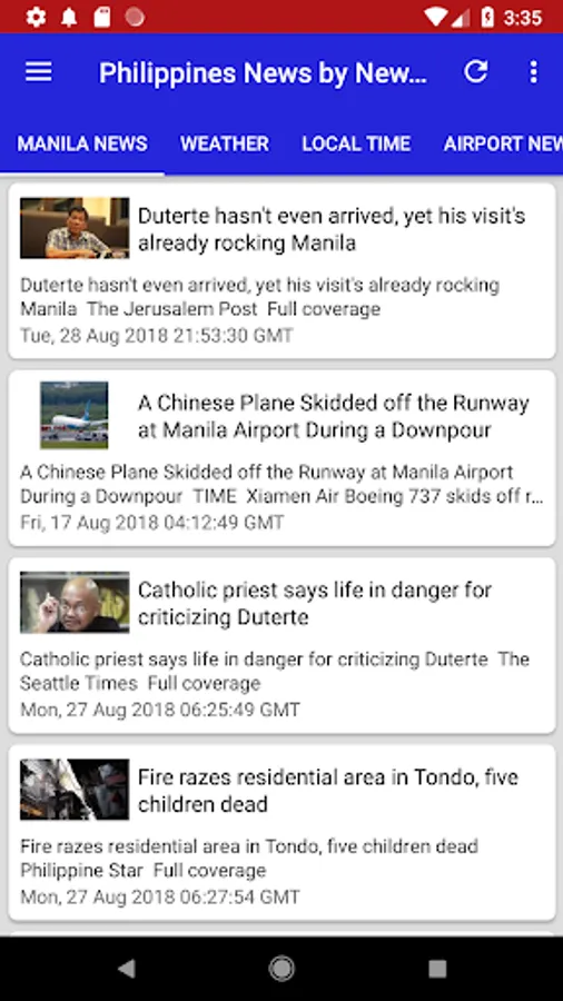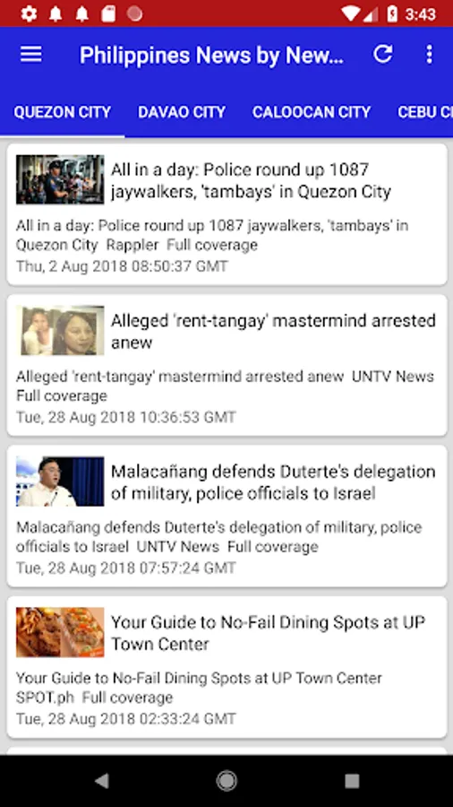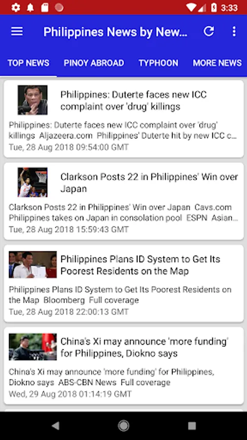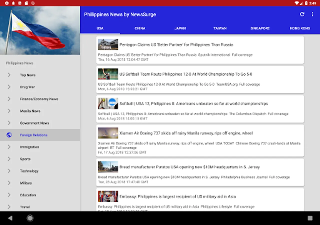 The latest Philippines News & Headlines today at your fingertips, with notifications support (You can change notification preferences in the Settings section of your Android Device)! Get the breaking news on the Philippines Drug War, celebrity updates, sports, typhoon warnings, and more. Individual news sections dedicated to top cities (Quezon City, Manila, Calooncan, etc) and provinces (Capiz, Cebu, Bhol, Palawan & more) will keep you informed about local happenings. News of top companies in the Philippines are also covered including Manulife Financial, BDO Unibank, Ayala and others.