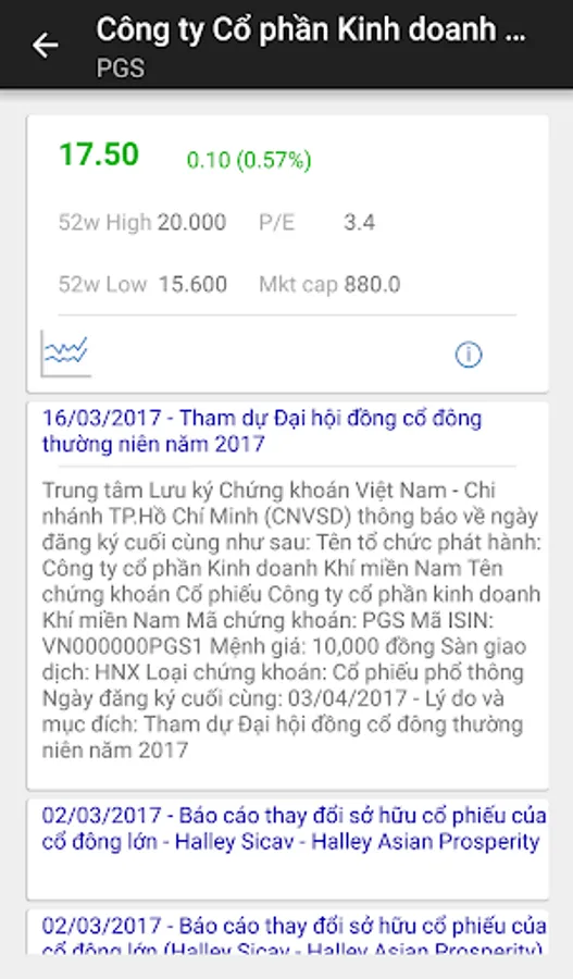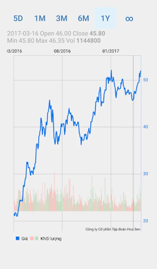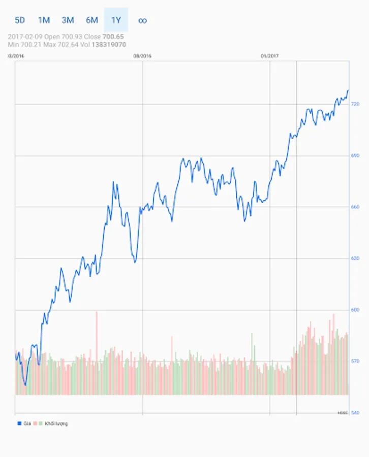 - Hiển thị biểu đồ cổ phiếu, giá và khối lượng giao dịch, các khoảng thời gian 5 ngày, 1 tháng, 3 tháng, 6 tháng, 1 năm và tối đa; người dùng ấn vào biểu tượng biểu đồ ở trang giá trị cổ phiếu (đối với cổ phiếu các công ty) hoặc ấn vào thông tin các chỉ số cơ bản (VN Index, HNX Index) ở màn hình chính