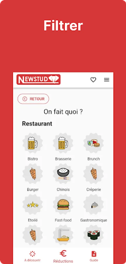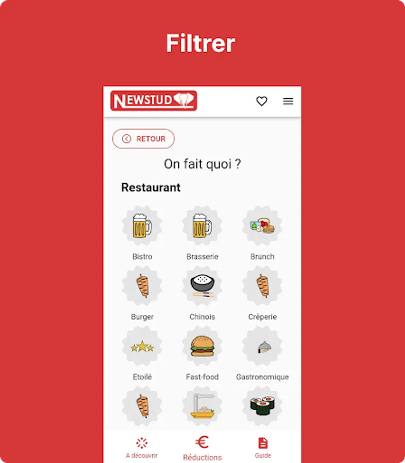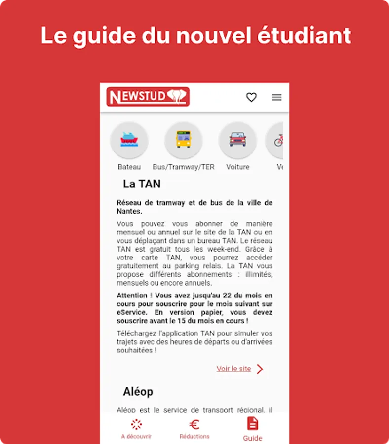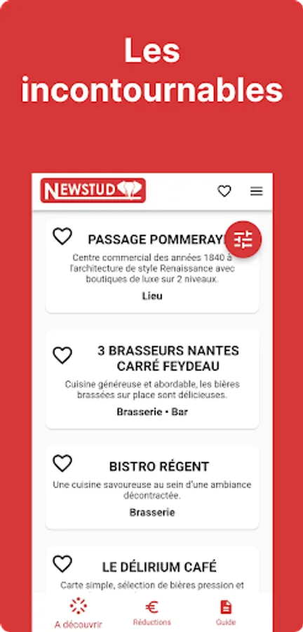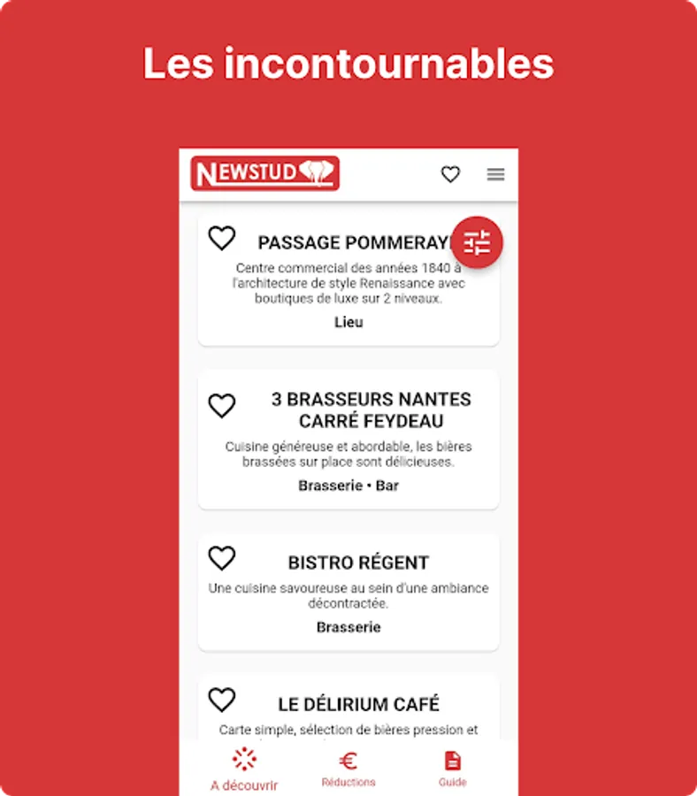 NewStud is an application for students from Nantes who want to discover their city, go out for a drink or find useful information on transport or good tips.