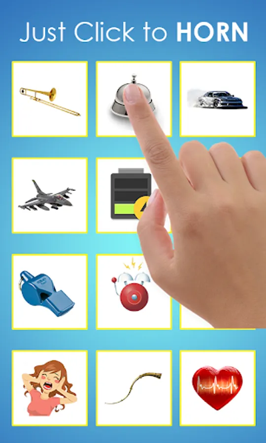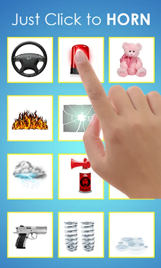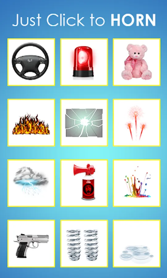 You just need to select the sound effect from the list of given sounds and long press on the selected sound, the sound will play with cool vibrate animation. The sounds include in application are, Air horn, Kombu, Steering wheels, Saxhorn, French horn, Police siren, ambulance siren, fire alarm bell, whistle, Fail button, Laser light, card, fire , perfume, camera, pistol, snake, clap, fire work, Spring, Fighter jet, Phone vibration, cloud, radio, bell and much more.