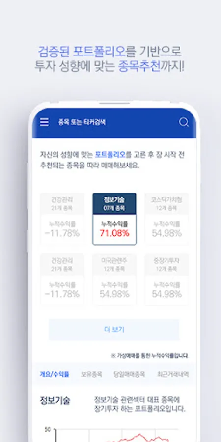 It shows the score by relative evaluation of all listed stocks, and the market leader can also be identified through the ranking service. Through the Model Portfolio service, you can receive stock recommendations of various inclinations.